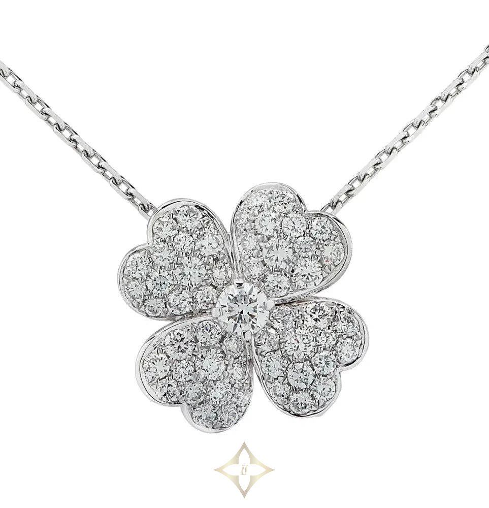 Van Cleef & Arpels Cosmos 1.57 Carat Diamond Pendant - V39213 SKU: 39213 PRICE: $21,000.00 Stunning Van Cleef & Arpels Cosmos Necklace crafted in 18 karat white gold, showcasing a clover shaped diamond pendant encrusted with 61 round brilliant cut diamonds weighing 1.57 carats total, D- F color, V-VS clarity. The clover shape pendant measures 16.86 mm in length and 16.81 mm in width. The chain measures 16 inches in length. It slides through the back of the pendant and closes with a lobster clasp. This gorgeous piece weighs 8.3 grams and can also be worn as a pin. Vivid Diamonds & Jewelry Floor 1 • The Historic Alfred I. duPont Building 169 E Flagler St #905, Miami, FL 33131, United States, Florida