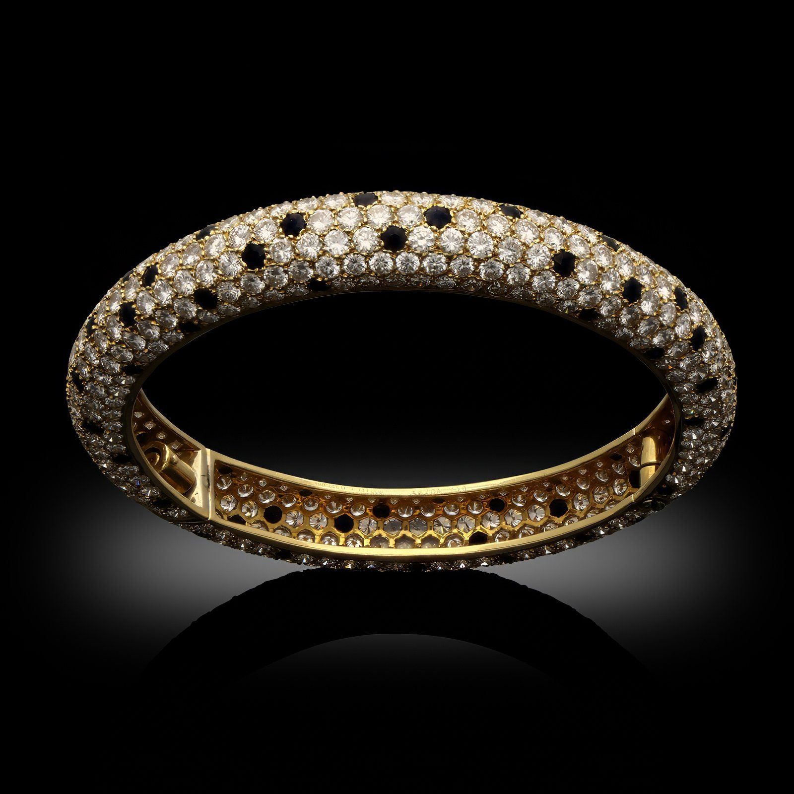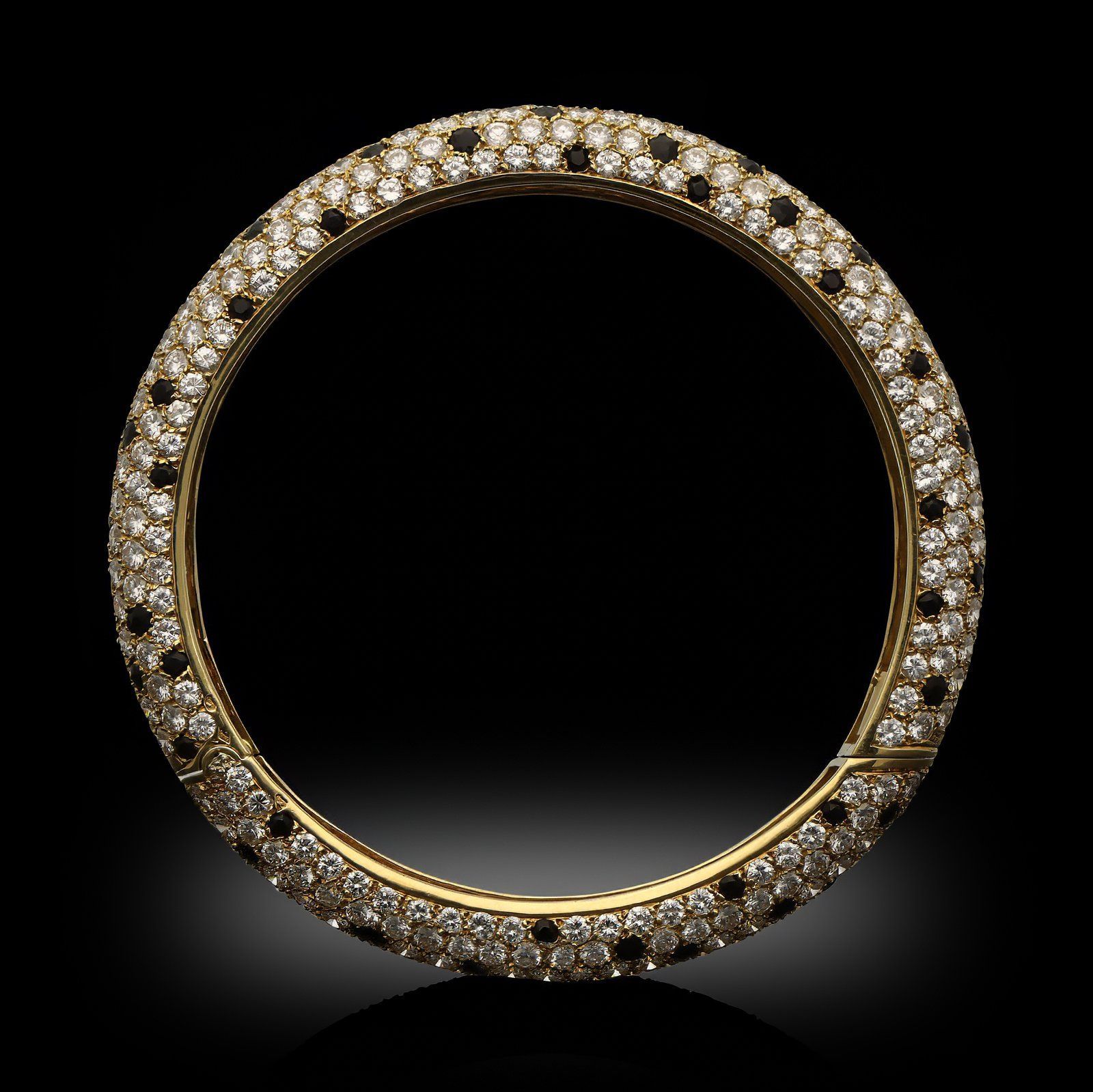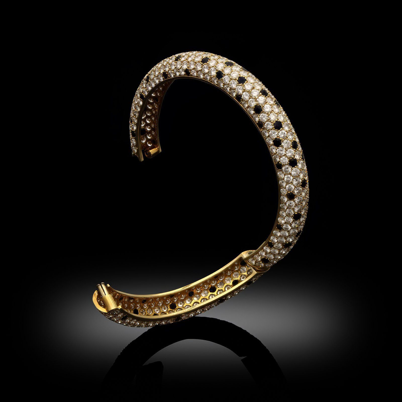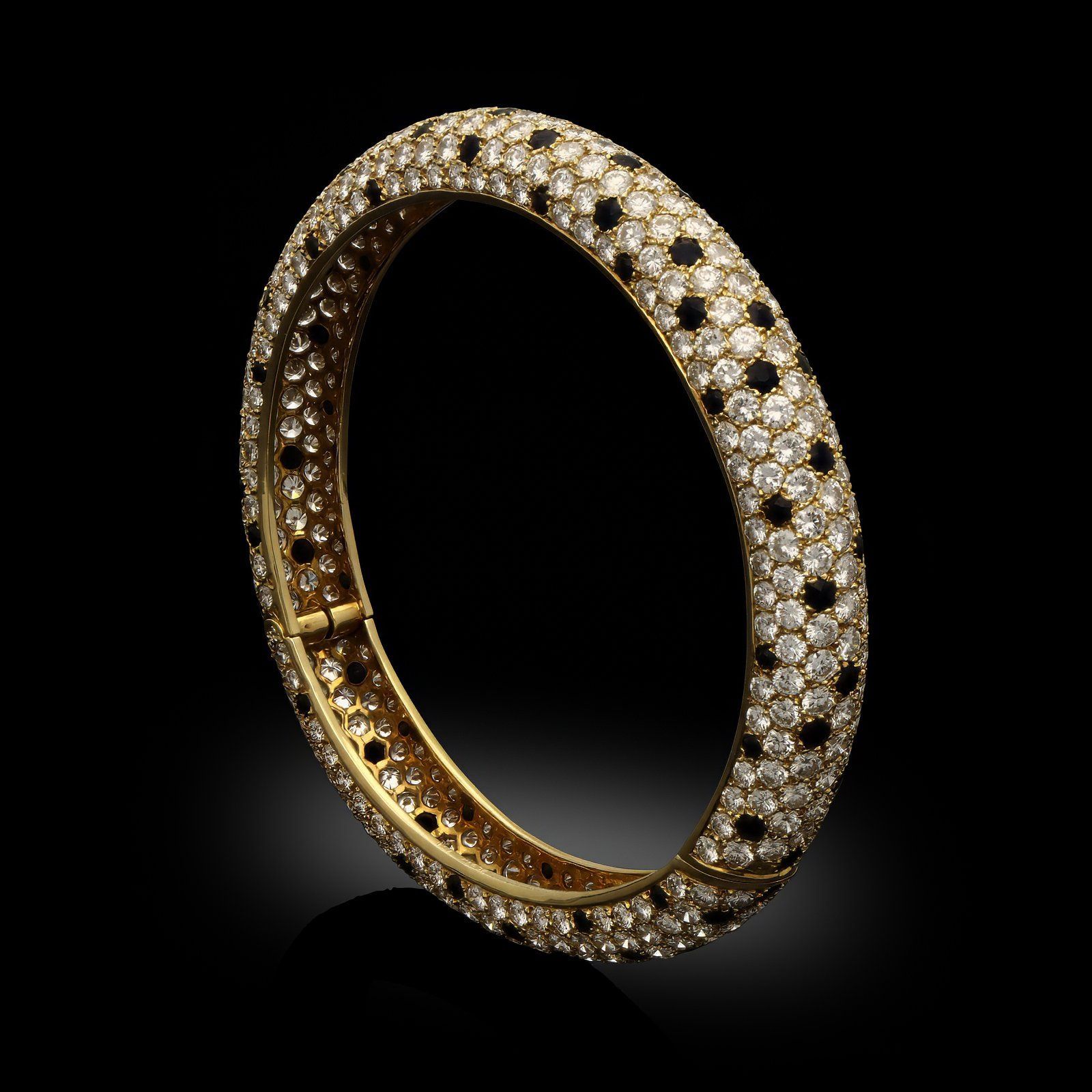 A vintage gold and diamond Panther bangle bracelet by Van Cleef & Arpels, 1976. The bangle pavé set throughout with round brilliant cut diamonds and interspersed with round faceted black onyx ‘spots’ all set in 18ct yellow gold. The design has a domed profile and opens with a side opening swivel hinge clasp.