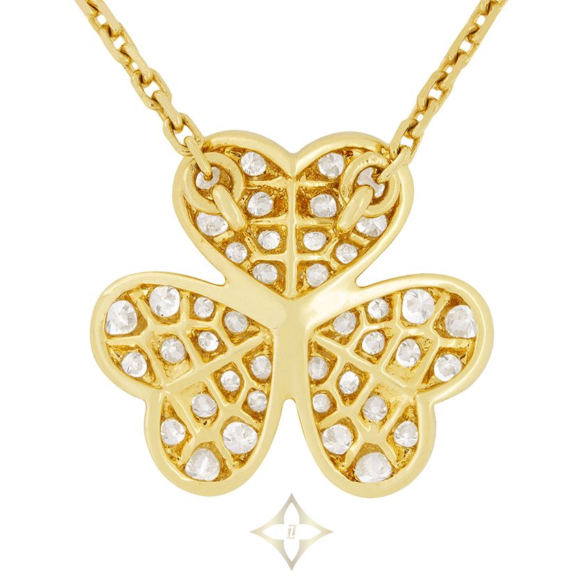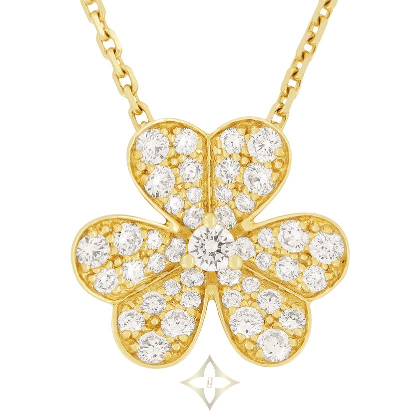 Van Cleef & Arpels Frivole Diamond Pendant 18 Carat Yellow Gold PRICE: £6,150.00 A beautiful diamond pendant from Van Cleef & Arpels Frivole collection. Each flower petal is set with an assortment of round brilliant cut diamonds, all varying in sizes. Combined, they total to 0.81 carats, including the larger central stone. Their quality varies from D-F in colour and IF-VVS in clarity. The heart shaped petals give a sweet and romantic look. It is a small model, in 18ct yellow gold with a 17″ chain. Gemstone: Diamond Stone Shape: Round Brilliant Carat Weight: 0.81 Colour: F Clarity: VVS Designer: Van Cleef & Arpels Metal: 18ct Yellow Gold Age: Modern, Pre-owned Farringdons Jewellery 32B Greville Street, Hatton Garden, London EC1N 8TB, UK Phone: +44 20 7242 2040 Email: info@farringdonsjewellery.com