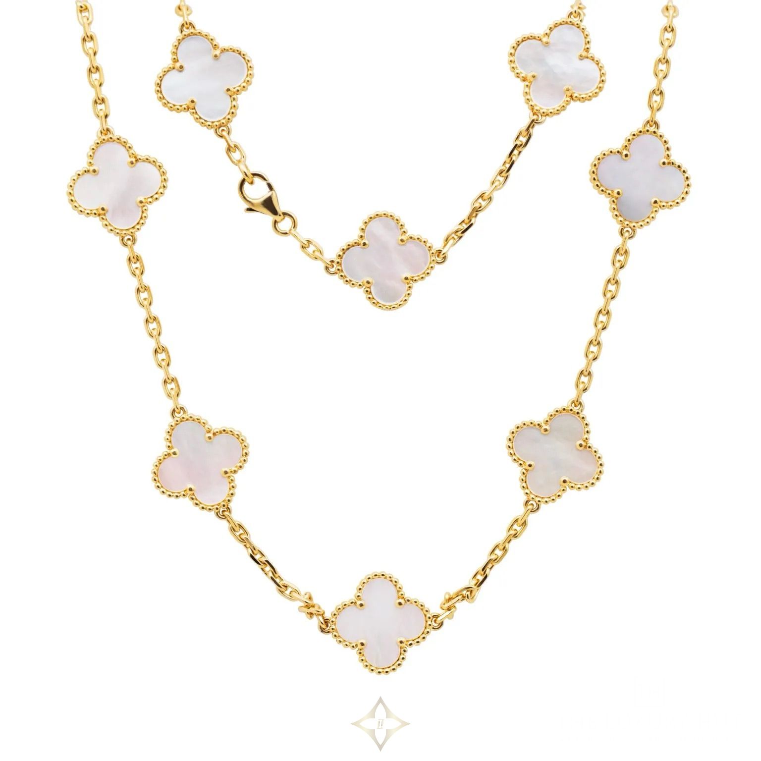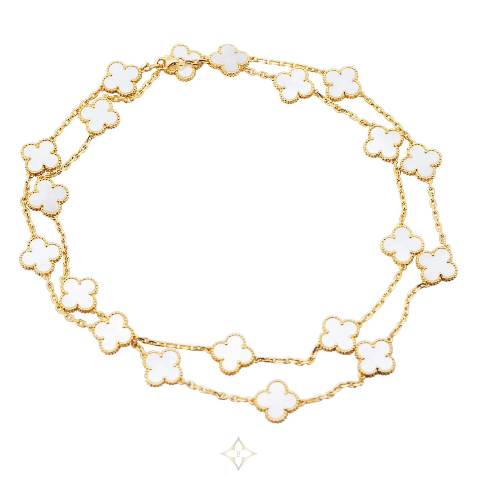 Van Cleef & Arpels Vintage Alhambra 18ct Yellow Gold 20 Motifs Mother-Of-Pearl Necklace Ref: VCARA42100 – 2010 PRICE: £15,000 Retail Value : £16,600.00 Condition: Excellent SKU: 52052 DESCRIPTION Van Cleef & Arpels Vintage Alhambra Necklace Ref: VCARA42100 In 18ct Yellow Gold With 20 White Mother-of-Pearl Motifs – From The Iconic Alhambra Collection. Originally Purchased From Van Cleef & Arpels On 16th June 2010 And Polished By Van Cleef & Arpels On 26th August 2025, This Exquisite Necklace Is Presented In Excellent Condition. It Comes Complete With The Original Van Cleef & Arpels Papers, A Copy Of The Original Purchase Invoice, Service Documents, And The Luxury Hut’s Certificate Of Authenticity. Retail Price: £16,600 Key Details: Gender: For Her Brand: Van Cleef & Arpels Collection: Alhambra Model / Reference: VCARA42100 Material: 18ct Yellow Gold Gemstones: 20 White Mother-of-Pearl Motifs Chain Length: 83cm Weight: 44.25 grams Year: 2010 Box: Pouch Papers: Yes Condition: Excellent Our Reference: 52052 DETAILS BRAND JEWELLERY Van Cleef & Arpels CONDITION Pre-Owned DEPARTMENTS Necklaces GEMSTONE Mother of Pearl GENDER For Her GOLD COLOUR Yellow Gold MATERIAL 18ct Gold ——— The Luxury Hut