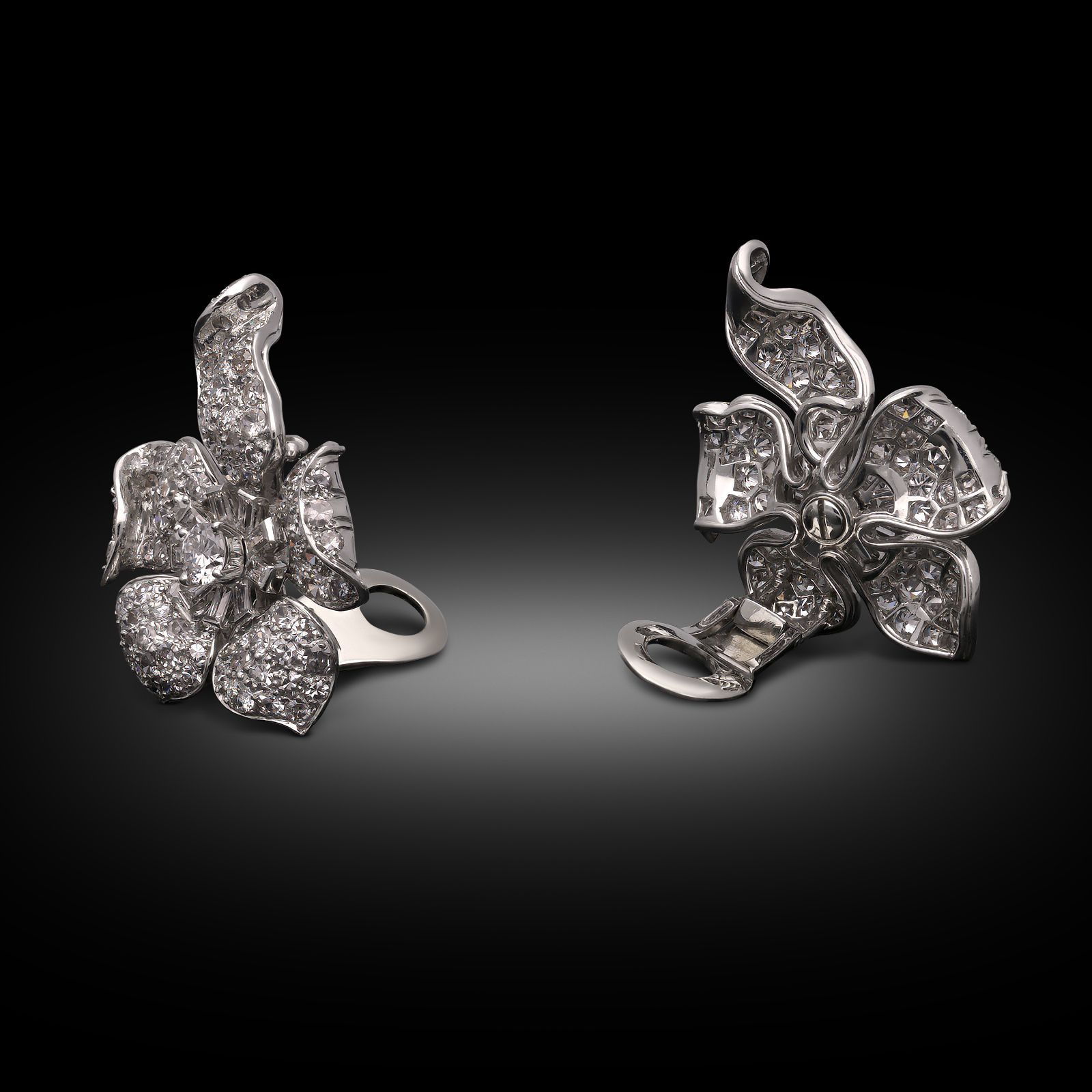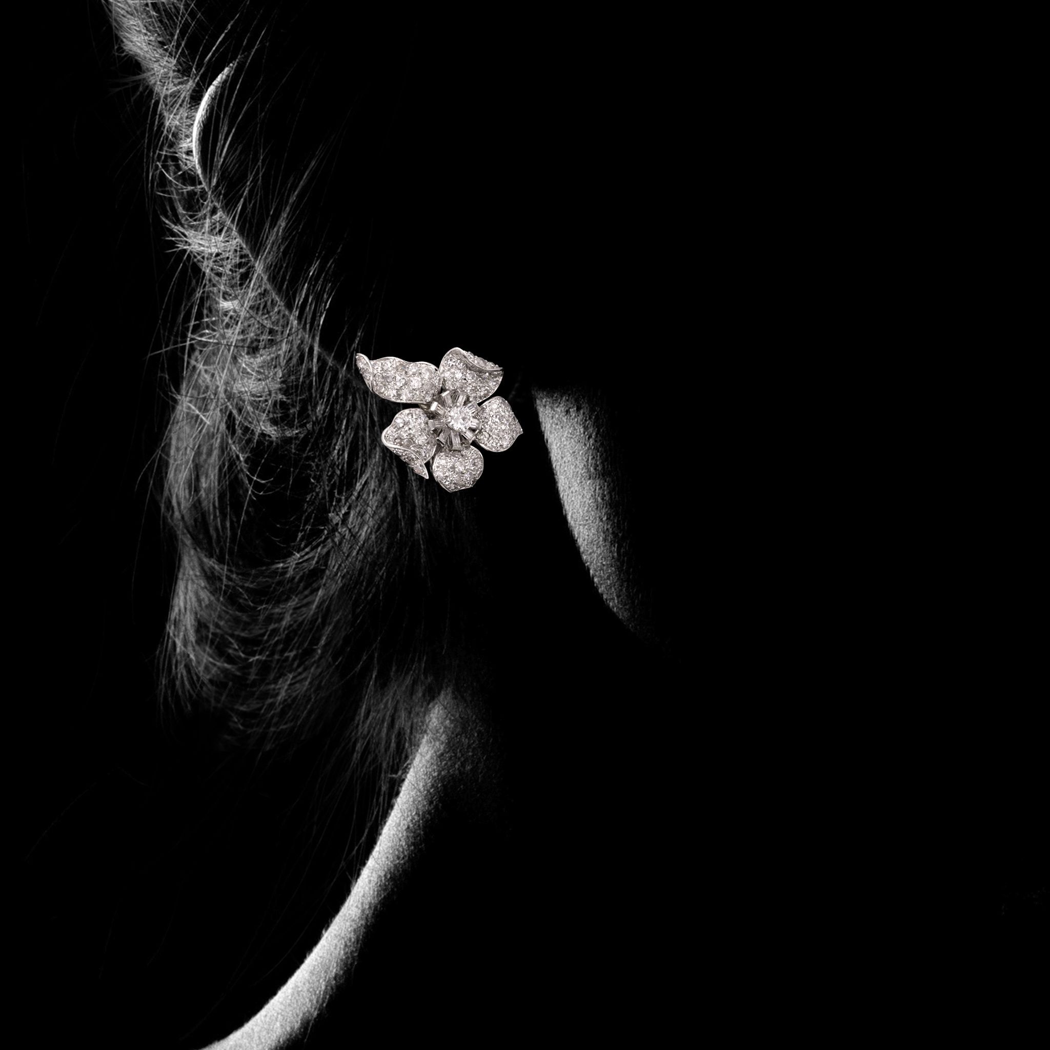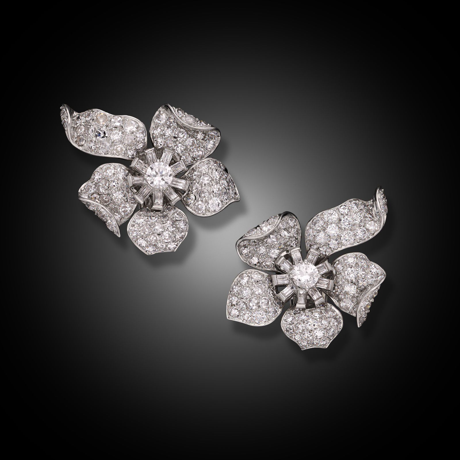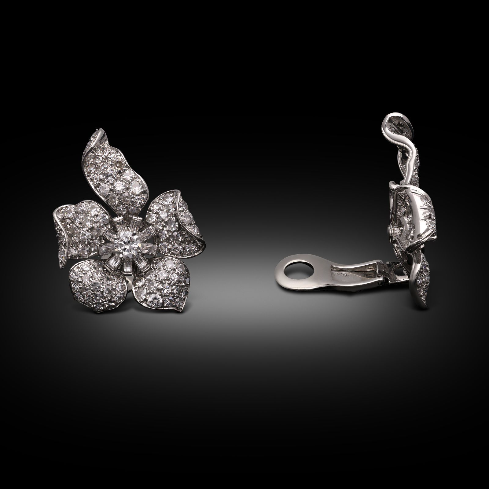 A pair of vintage diamond flower clip earrings by Van Cleef & Arpels New York, circa 1956. Each earring is designed as a stylised flower and is centred with a round brilliant cut diamond surrounded by baguette cut diamonds, the curved petals pavé set with circular cut diamonds, all mounted in platinum. They secure to the reverse with clip fittings.