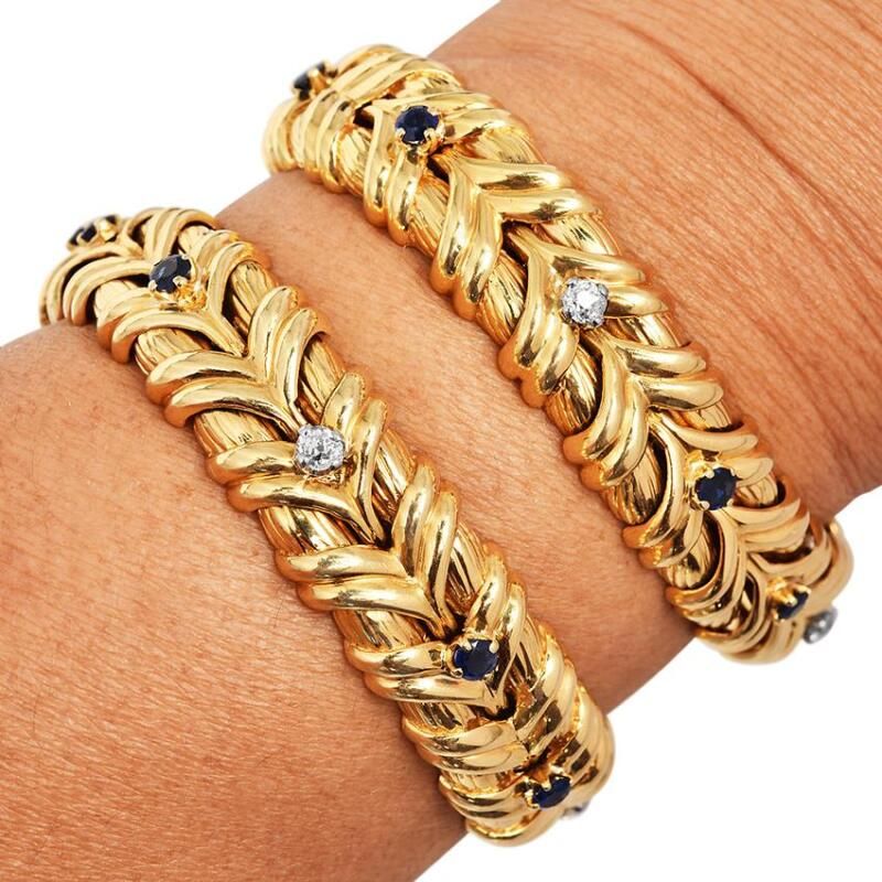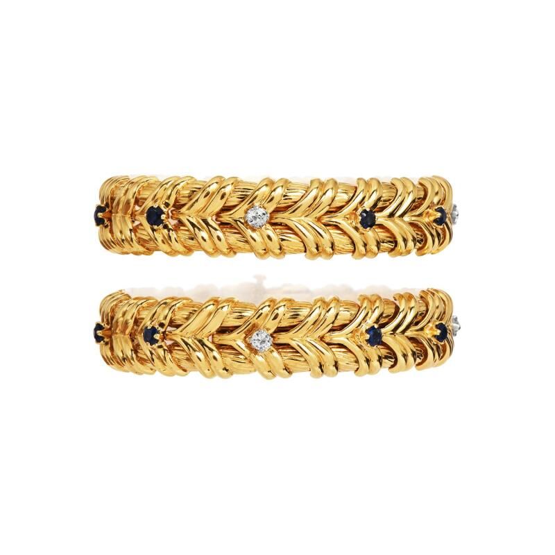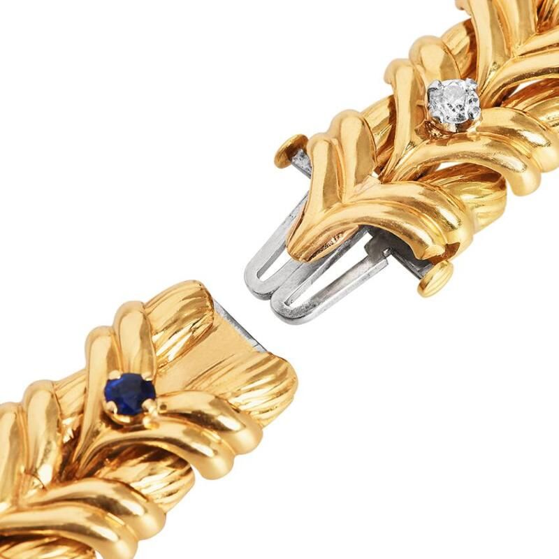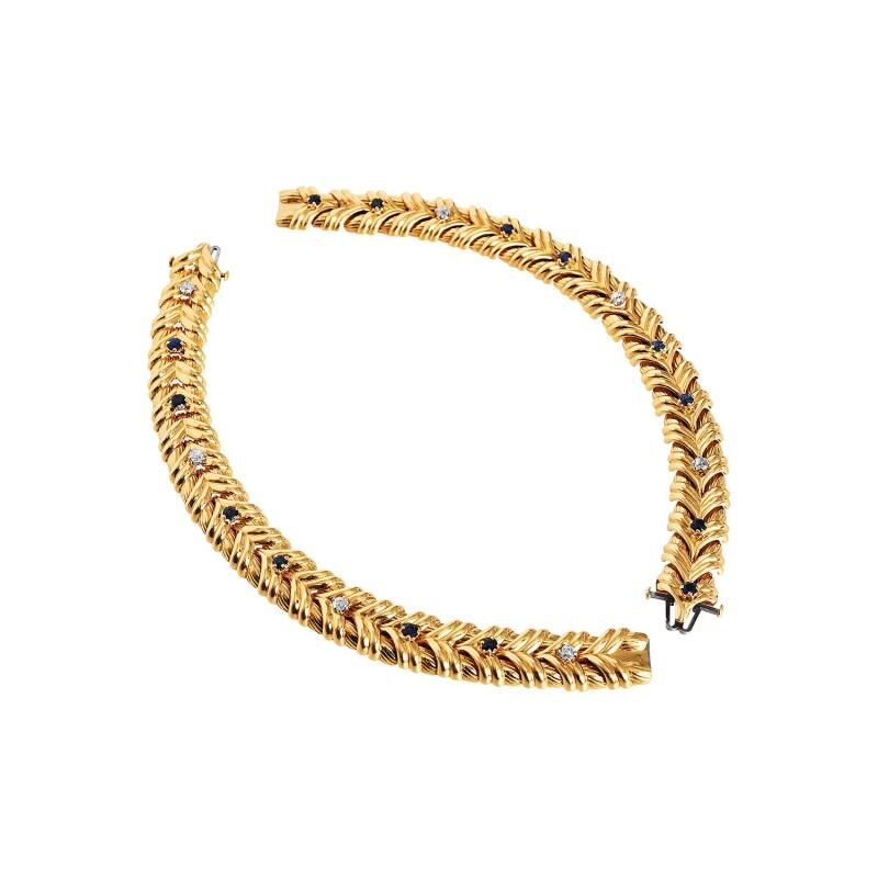 Van Cleef & Arpels Vintage Gold, Diamond and Sapphire Convertible Necklace Price: 65,000 USD • International shipping available Customs duties and taxes may apply. Ships from: Florida, United States • Taxes not included VAT and other taxes are not reflected in the listed pricing. • Authenticity guaranteed We guarantee the authenticity of this item. Description Of convertible design for wear as two bracelets or one collar necklace, composed of flexible gold links with a high polish finish, accented by round brilliant cut diamonds and round shaped sapphires. Diamonds weighing a total of approximately 1.50 carats Sapphires weighing a total of approximately 3.50 carats Signed Van Cleef & Arpels with serial number 18 karat yellow gold Circa 1948 Total weight 120.50 grams Length as a necklace 14½ inches, width 9⁄16 inch Length as bracelets 7¼ inches, width 9⁄16 inch Accompanied by a certificate of authenticity from Van Cleef & Arpels Accompanied by one Sotheby's folio Condition Report: Very Good Diamonds show approximate F-G color and VS1-VS2 clarity. Diamond information and grading is approximate and not guaranteed. Product is used. Necklace Type: Collar Materials: Gold, Yellow Gold, Sapphire, Diamond Color: Gold, Clear, Blue Karat: 18 Gender: Women's Occasion: Cocktail, Party season, Evening SKU: DK4FH ——— Sotheby's London 34–35 New Bond Street, London W1A 2AA, United Kingdom Phone: +44 20 7293 5000 CONTACT TEAM * Samuel Valette (Vice Chairman, Head of Private Sales, EMEA) Email: samuel.valette@sothebys.com
