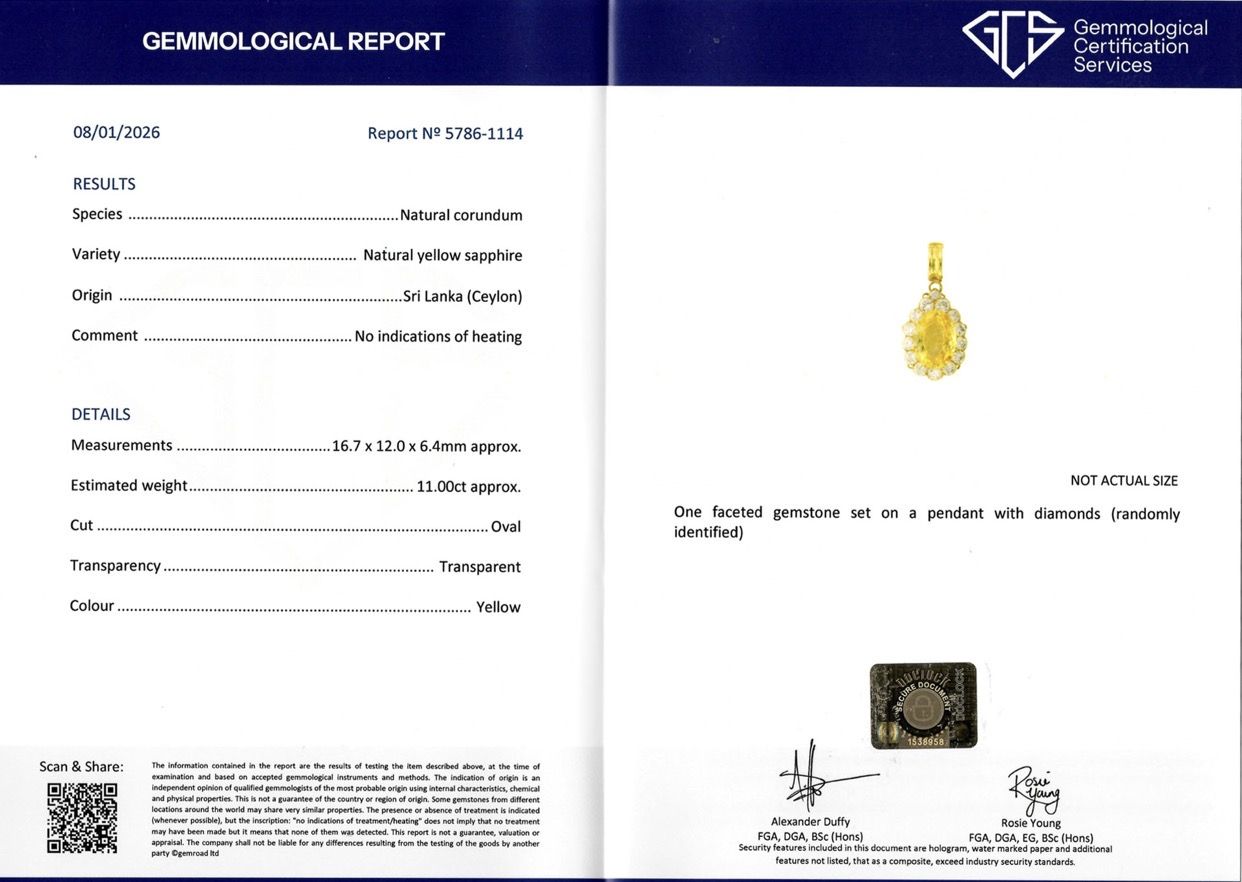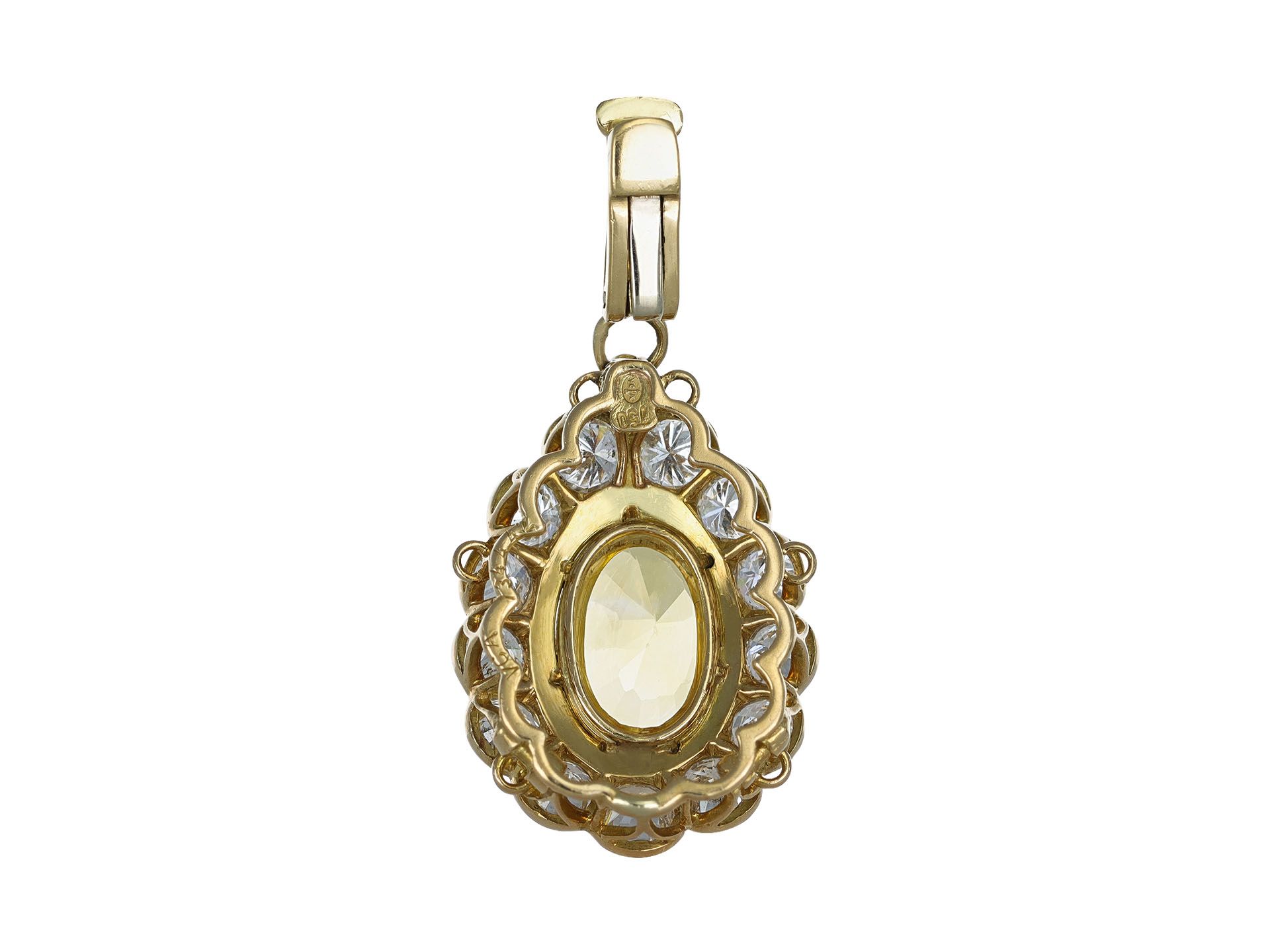 Van Cleef & Arpels Yellow Sapphire and diamond pendant. Set to centre with an oval brilliant cut natural no heat yellow sapphire in an open back claw setting with an approximate weight of 11.00 carats, adorned by fourteen round brilliant cut diamonds in open back grain and part-rubover settings with a combined approximate weight of 3.50 carats to an impressive pendant featuring polished scalloped edges, a decorative pierced gallery and fancy open backholing, fitted to top with a hinged bale, pendant approximately 4cm in length. Marked 18 carat yellow gold, numbered '134442', maker's mark for Van Cleef & Arpels, signed 'VCA', circa 1980, accompanied by Gemmological Certification Services report #5786-1114.