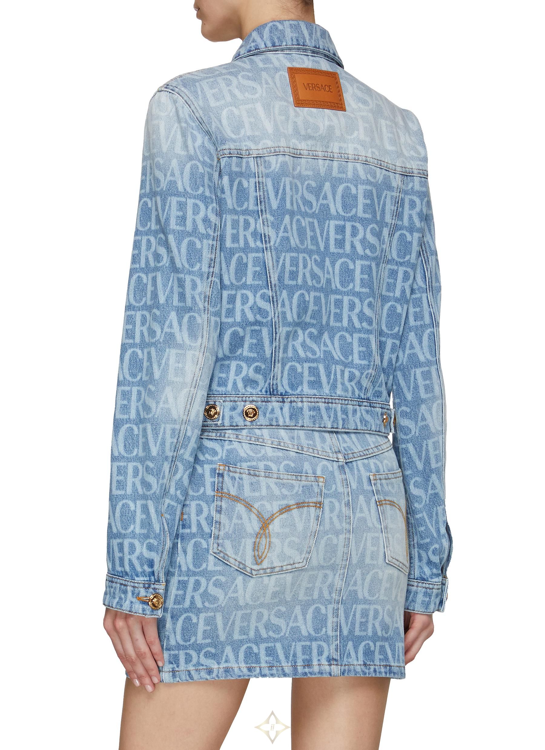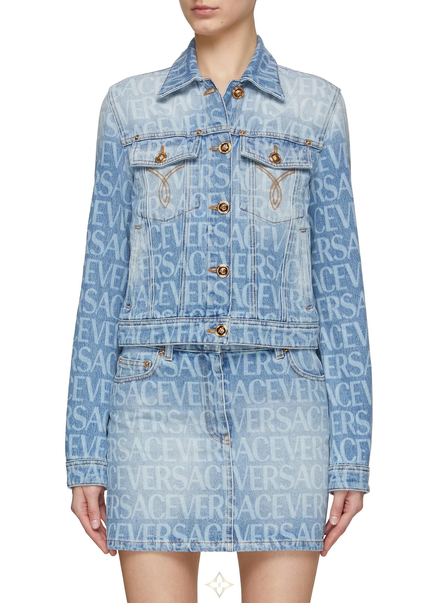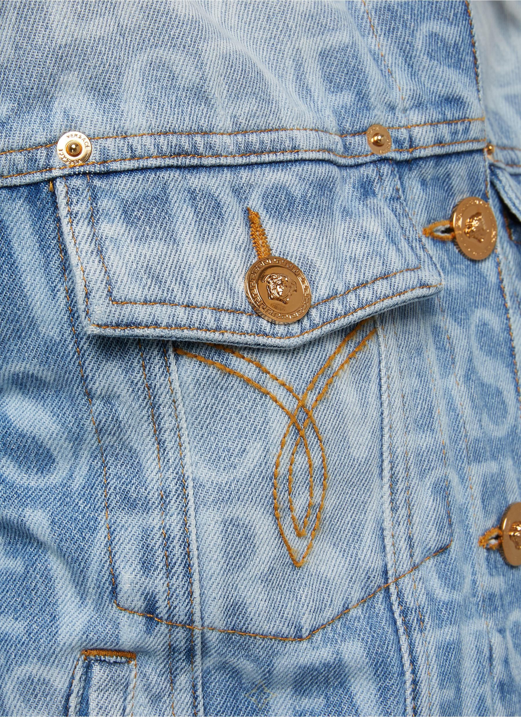 This jacket from Versace can be seen punctuated by an all-over logo pattern to make a statement. Ornamented with a gold-toned Medusa buttons, the piece is crafted from a washed denim fabric into a streamlined construction, completing a downtown look with the brand's matching denim mini skirt and a pair of leather boots.