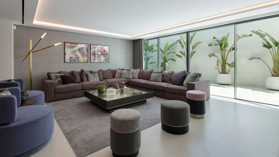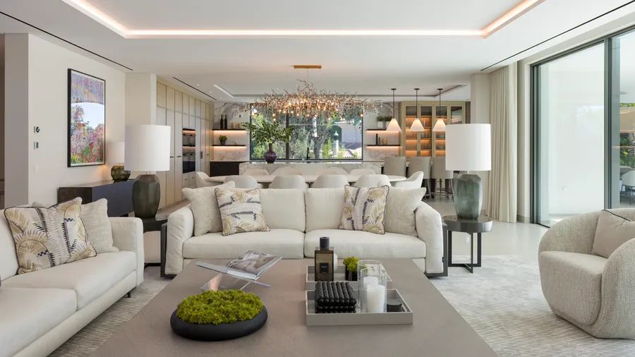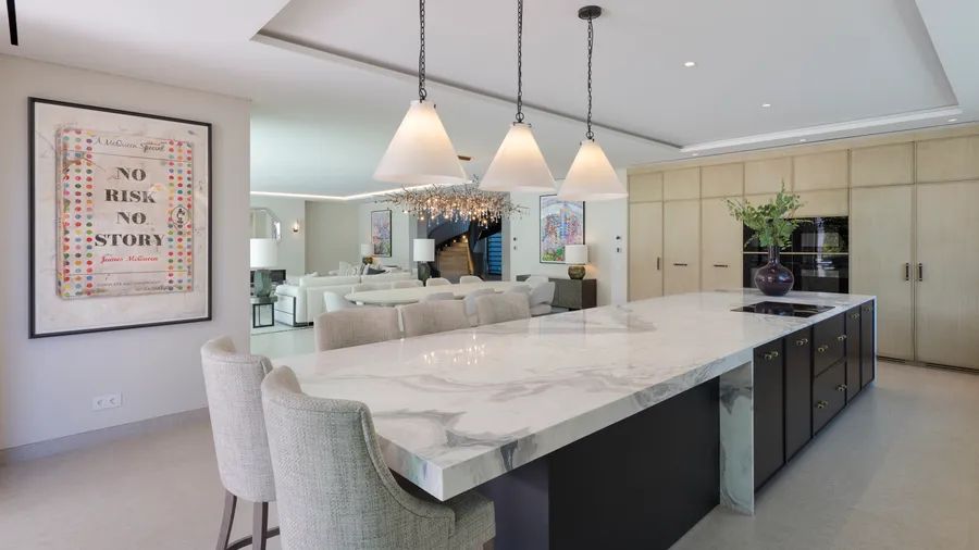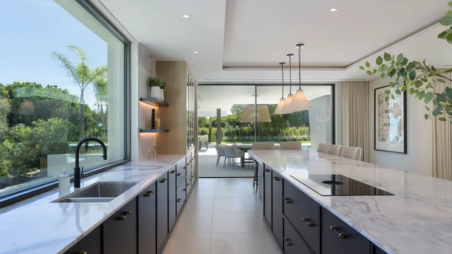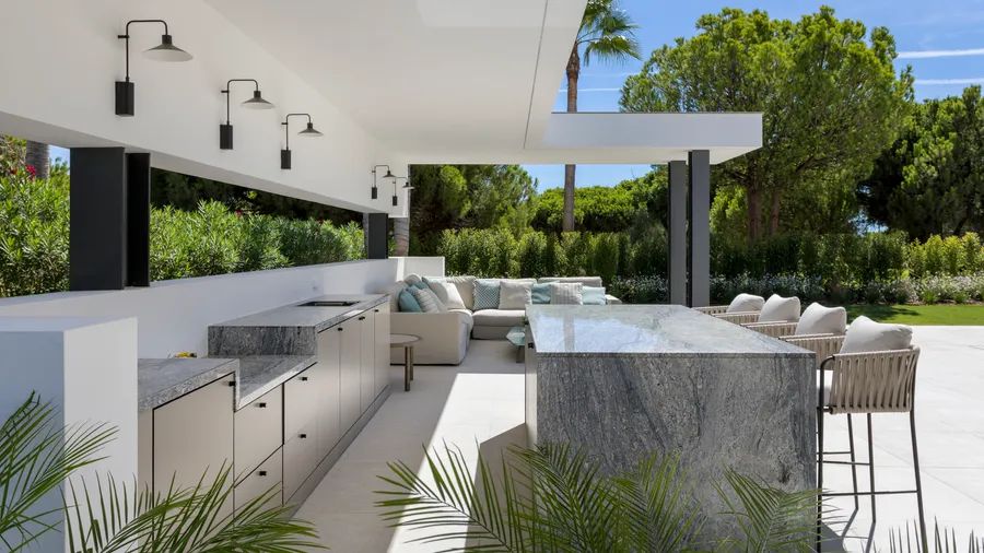 Expansive sliding glass doors create a seamless flow from indoors to outdoors, where multiple terraces, sitting areas, and a pre-installed outdoor kitchen and BBQ provide the perfect setting for relaxation and gatherings.