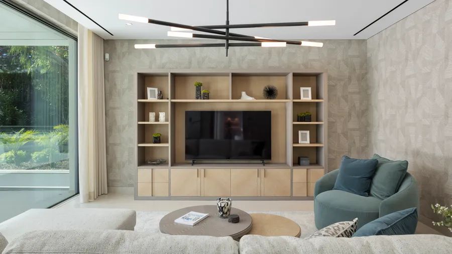 On the ground floor, the open-plan kitchen, dining, and living areas form the heart of this brand-new residence. A fireplace anchors the living space, complemented by an adjacent TV room. The extensive kitchen island is ideal for those who enjoy cooking and entertaining, while a wide window above the sink connects the interior with the surrounding greenery. Also on this level are two en suite bedrooms and an office, each beautifully framed by the landscaped gardens.