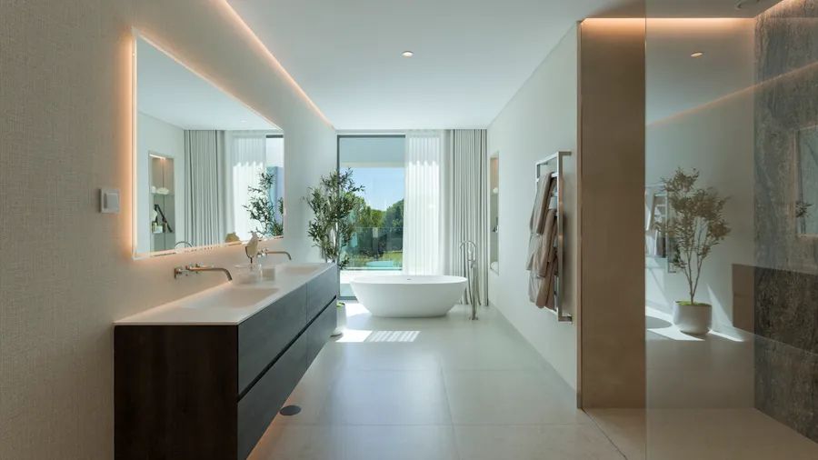 The first floor is dedicated to three spacious en suite bedrooms, including a central master suite with a sunny terrace and privileged views across the golf course. The roof terrace further impresses with panoramic views and proximity to the Ria Formosa Natural Park.