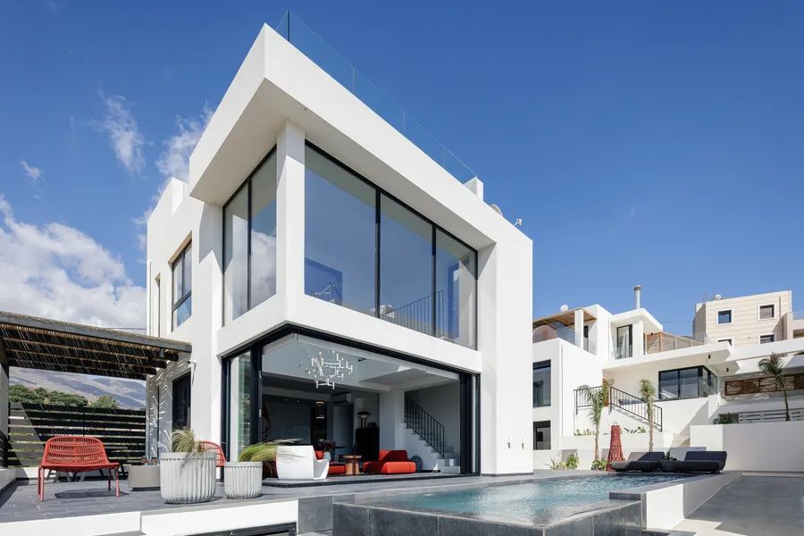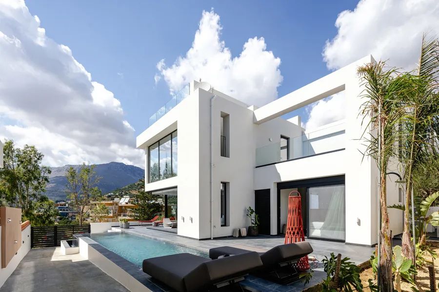 Outdoors, both villas feature private eco-friendly heated pools, outdoor showers, shaded seating areas under pergolas, two BBQs, and a wooden sauna. Parking is available for four vehicles. Modern comforts include air conditioning, fireplaces, double-glazed windows, high-end appliances, and designer finishes. The turnkey property also qualifies for the Greek Golden Visa, combining lifestyle appeal with long-term value.