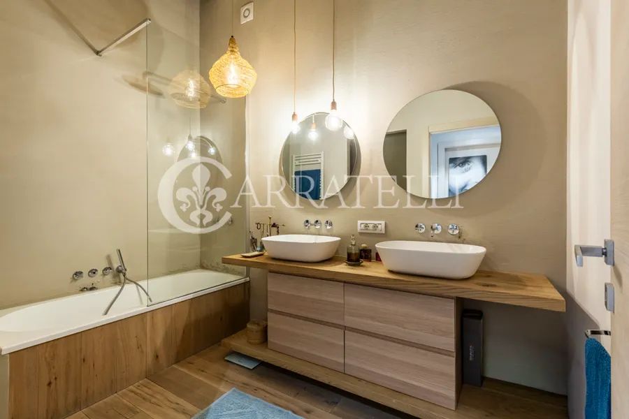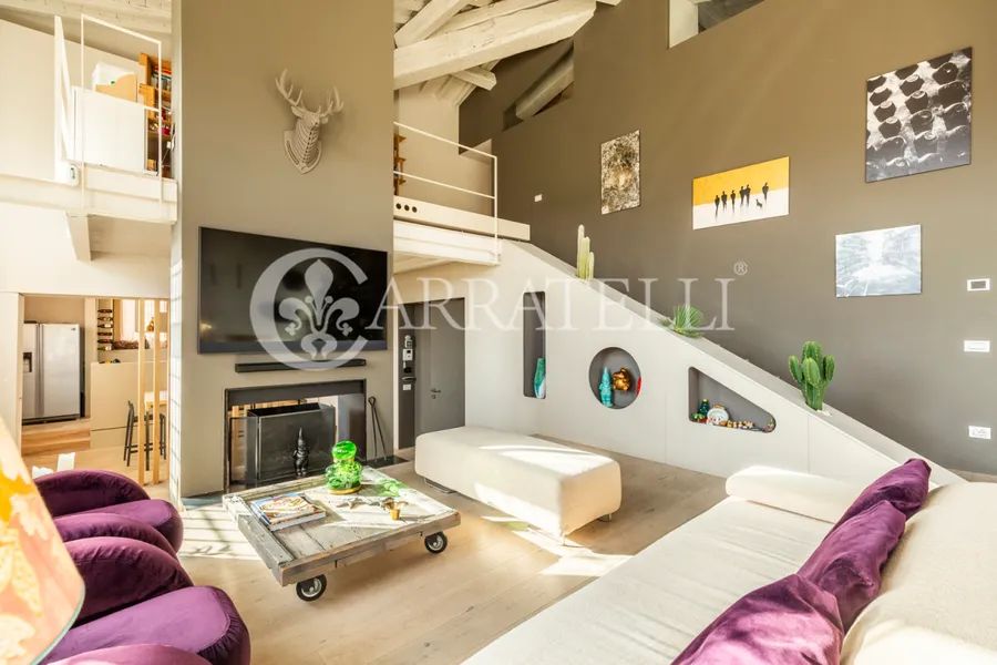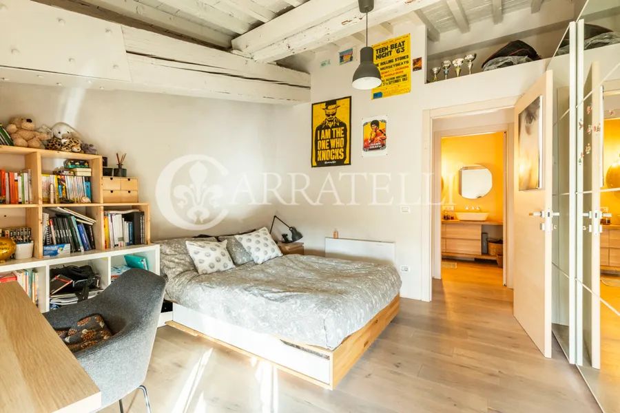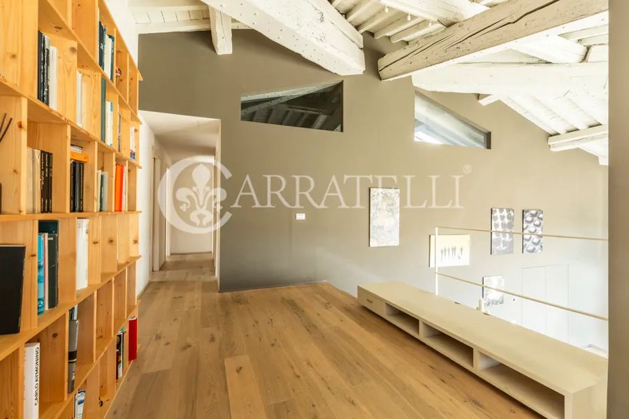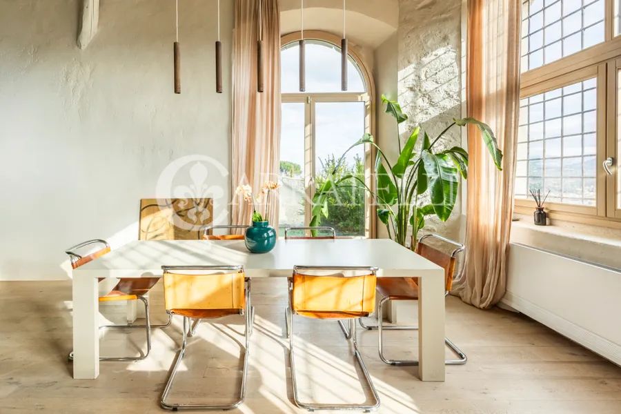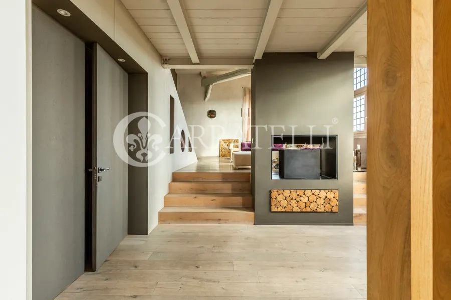 On the first hills of Florence, in Pian dei Giullari, this prestigious portion of a former private wood shed is part of a complex dating back to the 15th century, around 1400, converted into a residence in 2016. The property, protected as a site of historical-architectural interest, is situated within an exclusive condominium of only two units with equal shares. The total gross area is approximately 525 sqm distributed over three levels, characterized by spacious, bright environments and a refined blend of historic architecture and contemporary design. The living level is accessible via an internal staircase and offers a large double lounge, extremely luminous thanks to large glass walls that guarantee a constant natural light throughout the day. Currently on this level are two kitchens, a dressing room, and a bathroom. The first floor hosts the main sleeping area, consisting of three bedrooms and three bathrooms, designed for comfort, privacy, and functionality. On the ground floor, there is an additional apartment, presently used as an office but cadastrally registered as a residential unit. This space includes a living room, kitchen, one bedroom, and a bathroom, ideal as an independent unit for guests, staff, or professional use.