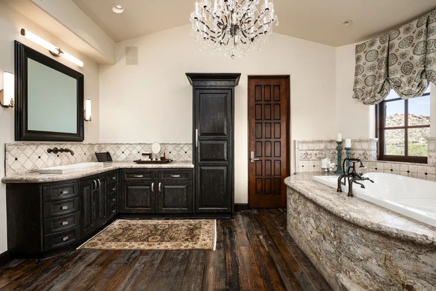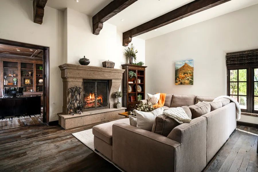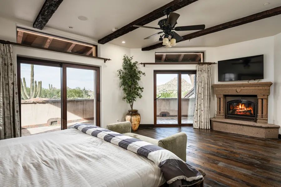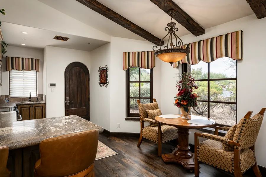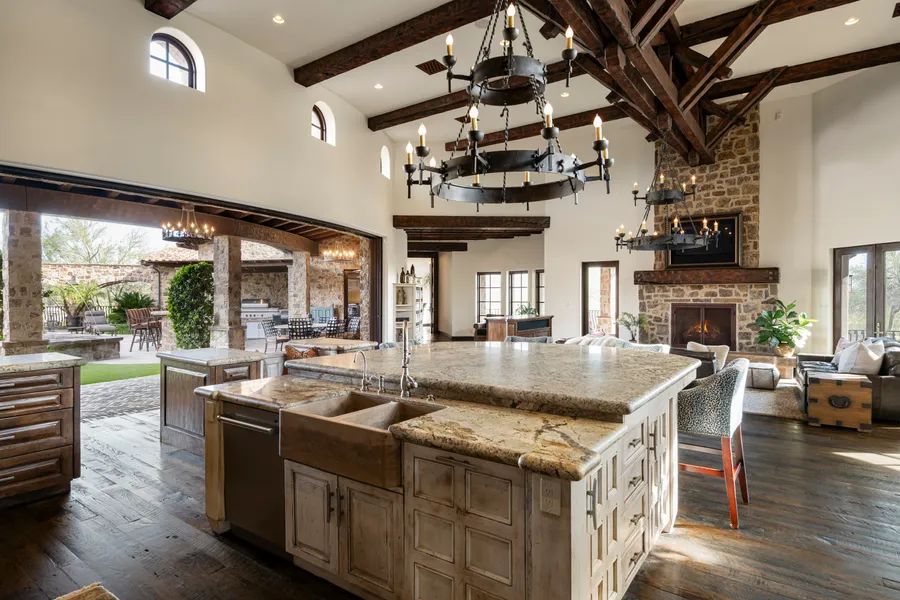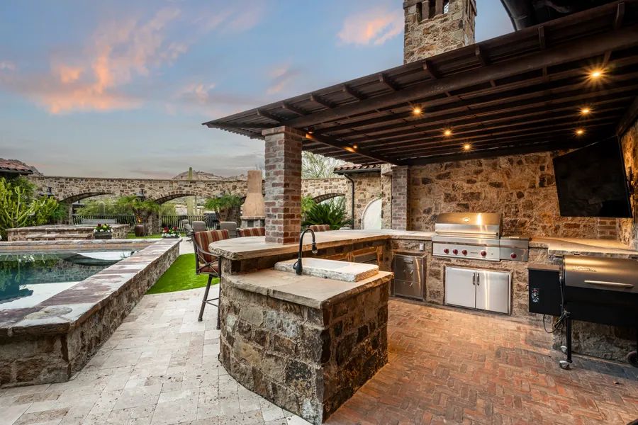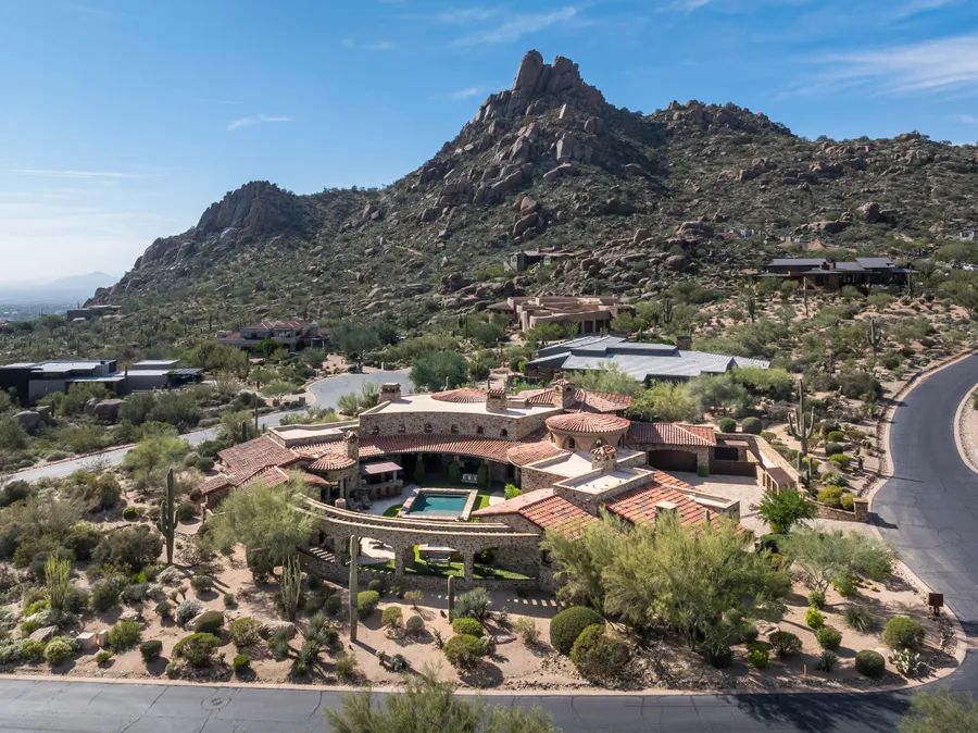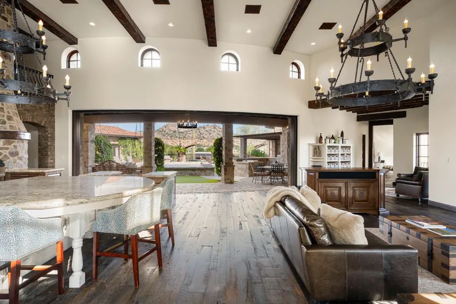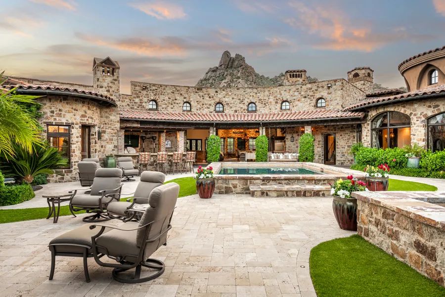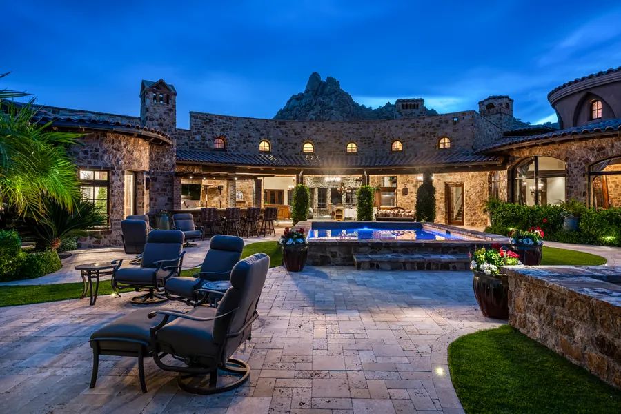 Situated beneath the dramatic backdrop of Pinnacle Peak, this custom Estancia estate showcases exceptional craftsmanship and every luxury amenity. The expansive great room anchors the residence and flows seamlessly into the gourmet kitchen, complete with a wood-burning pizza oven and premium finishes. A motorized, fully retractable 30-foot curved glass wall opens to a resort-style outdoor living space featuring a pool, spa, multiple fireplaces, water features, and a full outdoor kitchen.