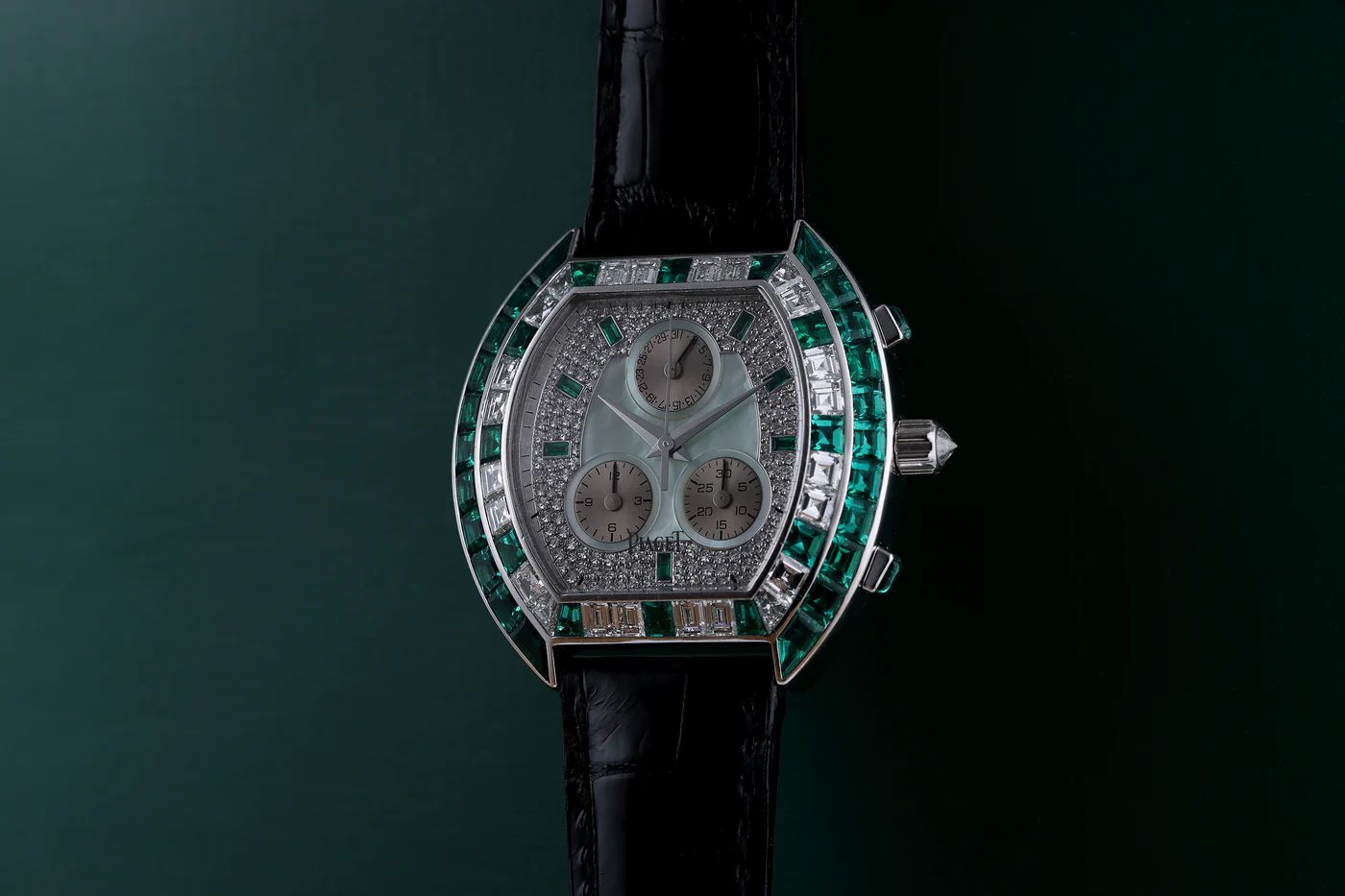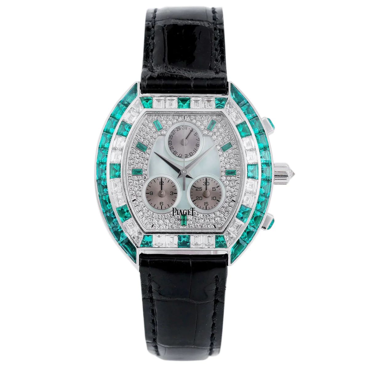 PIAGET CHRONOGRAPH | REF. 14488 | GREEN MOTHER OF PEARL & PAVE DIAMOND DIAL, EMERALD HOURS | EMERALD & DIAMOND BEZEL | 18K WHITE GOLD | CIRCA 1990'S SALE PRICE: £49,500.00 SKU: 024291101 DESCRIPTION Pre-owned, excellent condition Vintage Piaget Chronograph reference 14488 18k White Gold unisex wristwatch. Pave diamond dial with Green Mother of Pearl center, pave diamond outer dial with Emerald hour markers, an 18k White Gold 35mm case, initial diamond & Emerald bezel & an outer full Emerald bezel, diamond winder, Emerald chronographer pushers, an unworn Piaget black leather strap and an 18k White Gold Piaget classic pin buckle, sapphire crystal glass and quartz movement. This watch comes with our Watch Collectors certificate of authenticity, box and 24 months warranty. Circa 1990's. This watch has been checked against technical records to guarantee authenticity and clean history. SPECIFICATIONS Brand: Piaget Model: Chronograph Model Number: 14488 Case Width (mm): 35 Case Material: 18k White Gold Bracelet Material: Leather Box: No - Comes With Watch Collectors Box Papers: No - Comes With Proof Of Authenticity Year: 2000s Product Code: 024291101 ——— Watch Collectors (Astrolabium Ltd) Company Registration No: 08424635 VAT No: GB159071109 21-22 Grosvenor Street, Mayfair, London, W1K 4QJ, United Kingdom Tel: +44 207 993 6865 WhatsApp: +44 20 7993 6865 Email: info@watchcollectors.co.uk