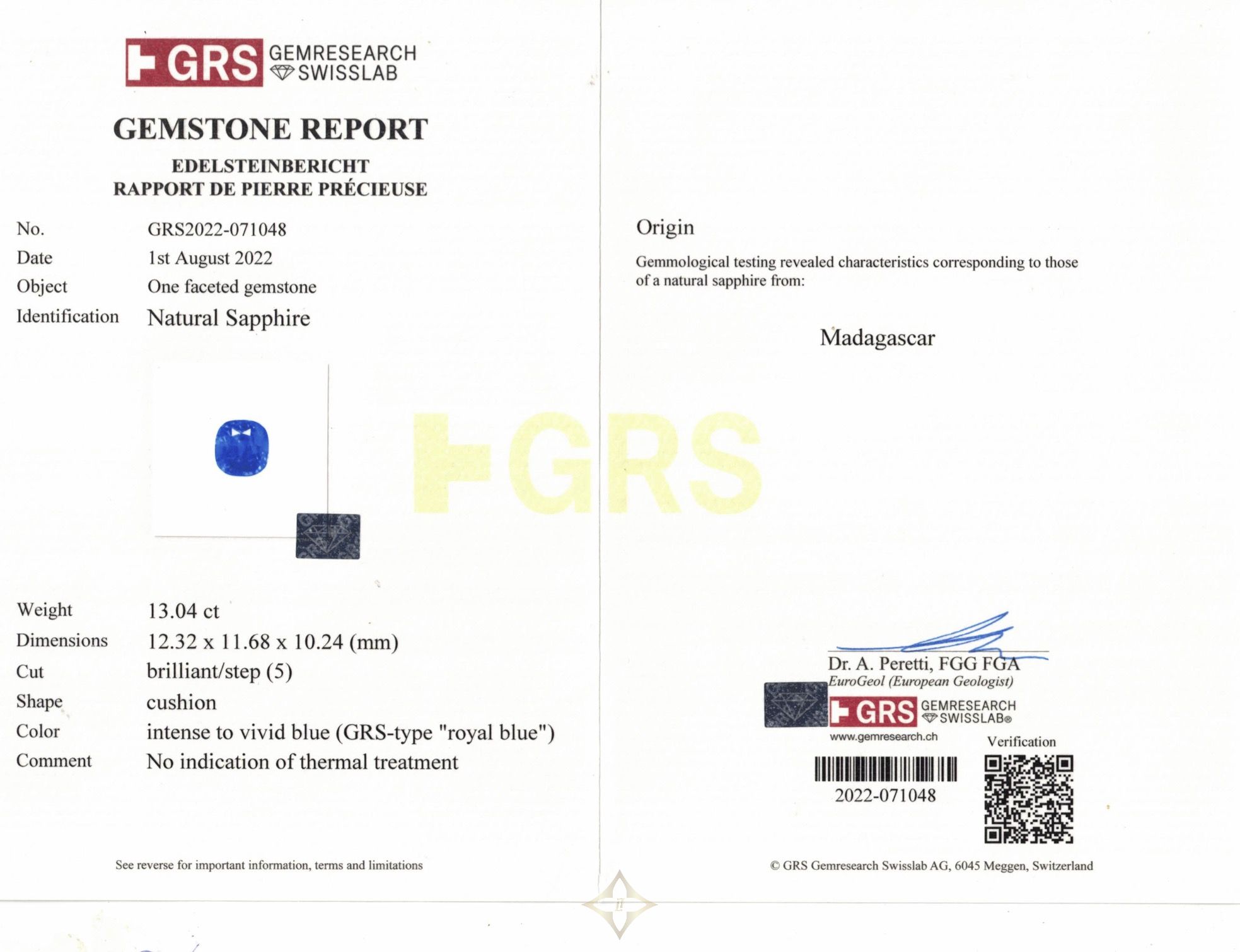 Accompanied by GRS report no.2022-071048, dated 01 August 2022, stating that the 13.04 carat natural sapphire originate from Madagascar, exhibiting intense to vivid blue color (GRS-type "royal blue") with no indications of thermal treatment