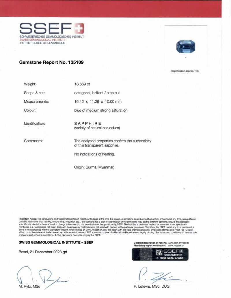 Accompanied by SSEF report no. 135109, dated 21 December 2023, stating that the 18.669 carat sapphire originate from Burma (Myanmar) with no indications of heating