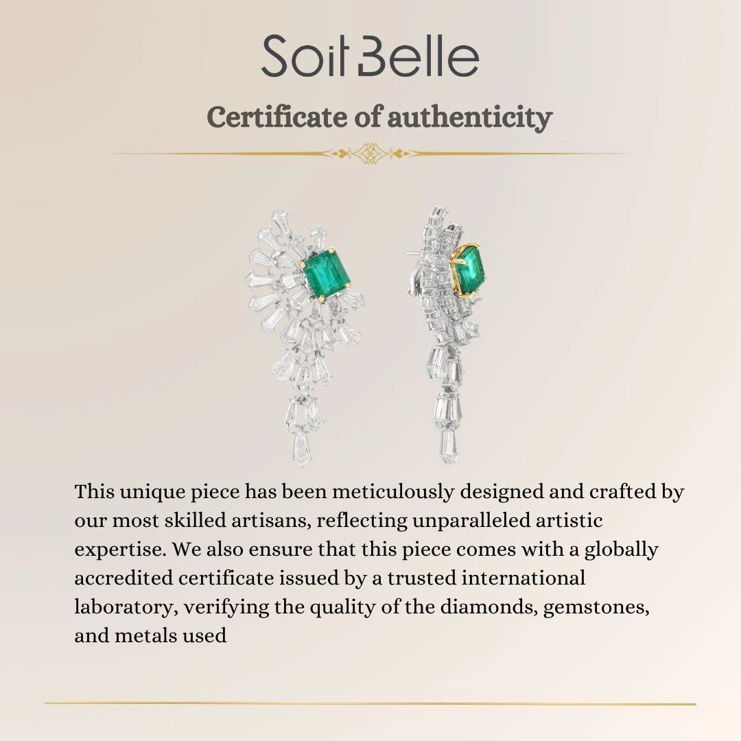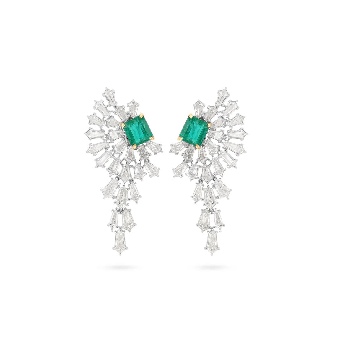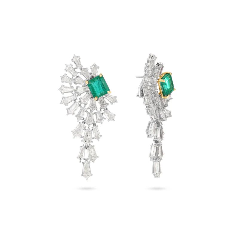 At the center of each earring lies a vibrant, emerald-cut green emerald, hand-selected for its exceptional clarity and deep color. The center stones are securely prong-set, maximizing their brilliance and allowing light to pass through with breathtaking clarity.
