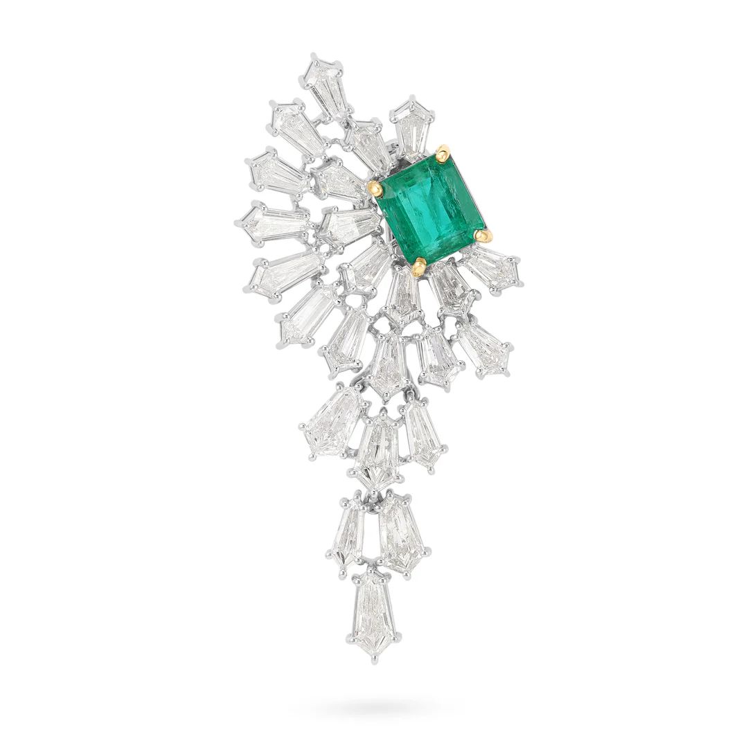 Surrounding each emerald is a radiant halo of kite-cut diamonds, precisely arranged to reflect light at every angle. This unique cut adds geometric sophistication and enhances the emerald’s natural glow.