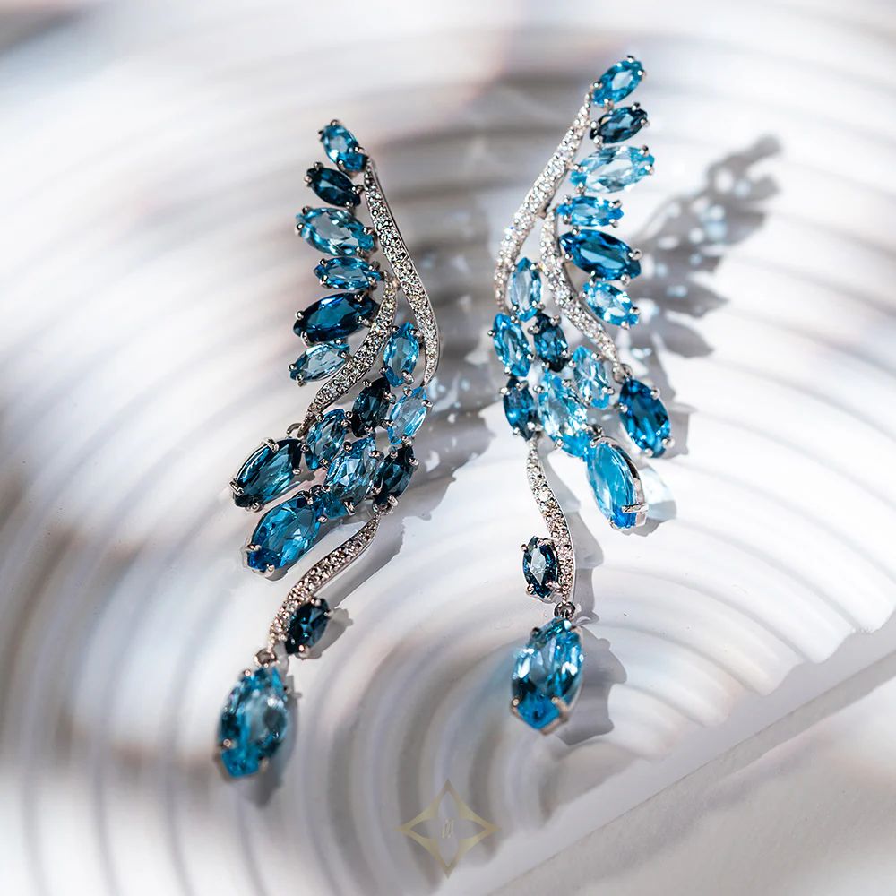 WHITE GOLD PLUMA EARRINGS WITH LONDON TOPAZ, SKY TOPAZ, SWISS TOPAZ AND DIAMONDS | São Paulo 🇧🇷