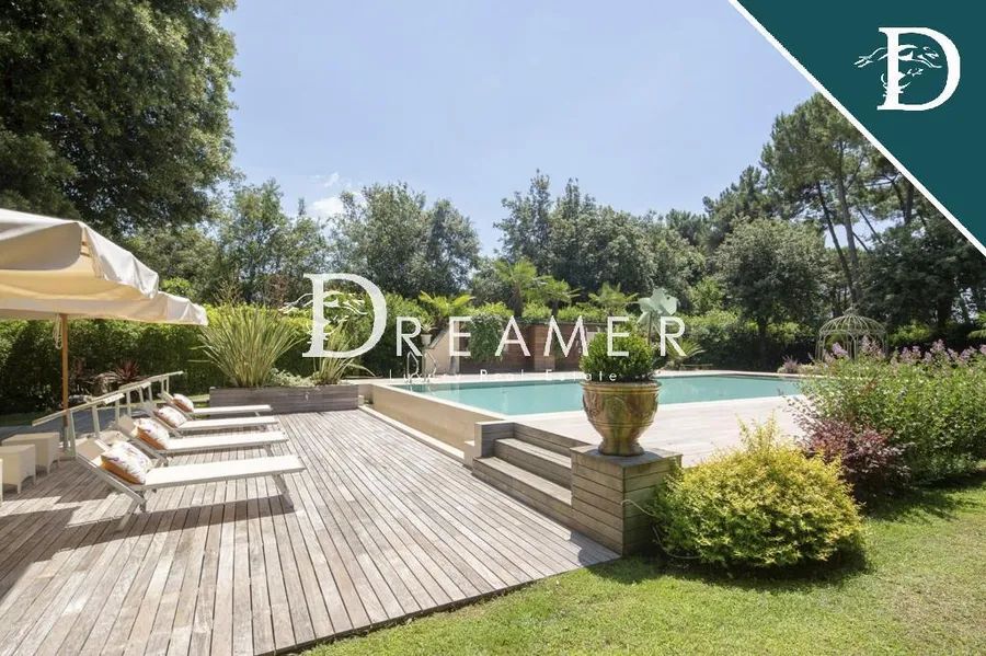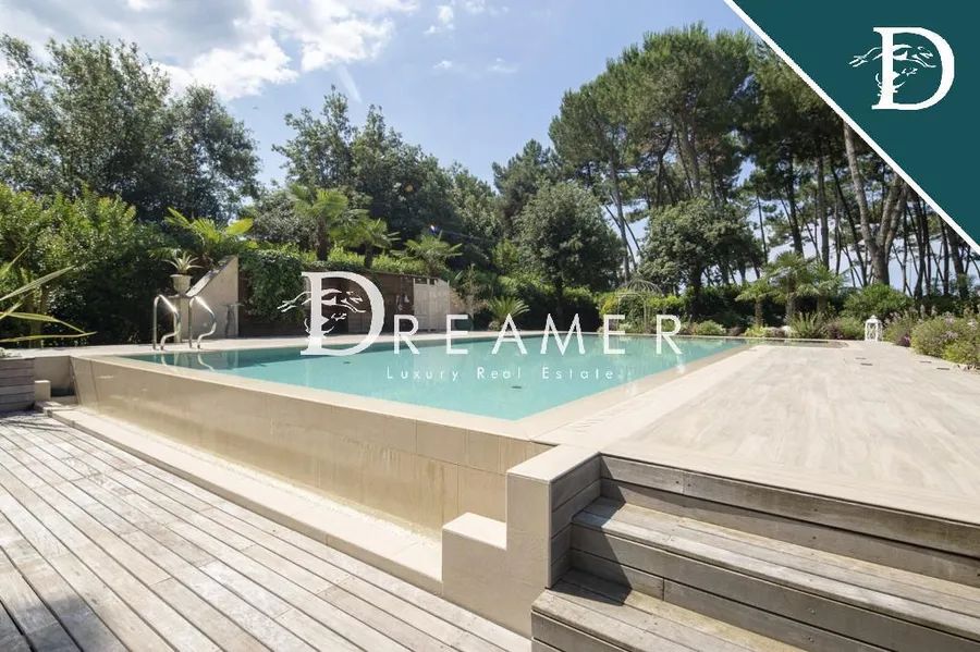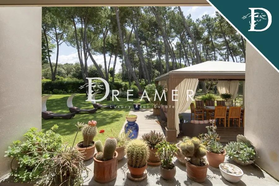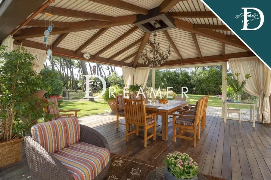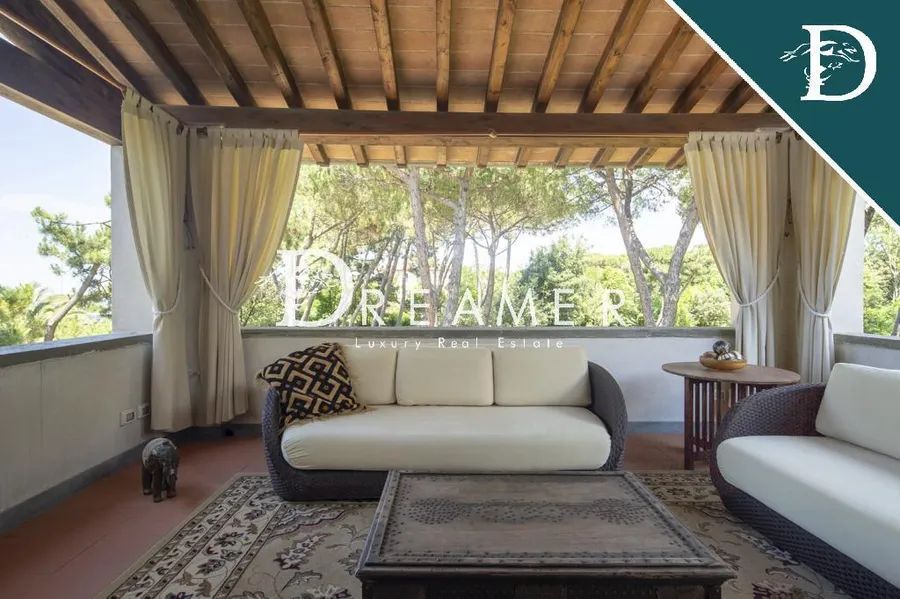 The complex is nestled in a private park of extraordinary elegance, designed by a renowned landscape architect. The green area harmoniously unfolds between majestic maritime pines and a refined English garden, creating a setting of absolute tranquility and beauty. The scenic centerpiece of the park is a refined wooden gazebo, designed as an exclusive outdoor lounge, elegantly furnished with sofas, tables, and chairs, ideal for relaxing moments immersed in nature. The property is enhanced by a recently installed infinity pool, featuring steps and differentiated water levels, outdoor showers, and a large relaxation area with loungers. Adjacent to the pool is a fully equipped solarium area, complete with changing rooms and restrooms, designed for maximum comfort. The property also includes a private tennis court and covered parking for six cars.