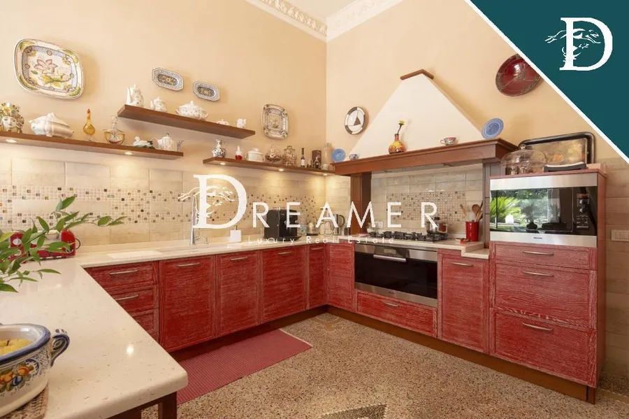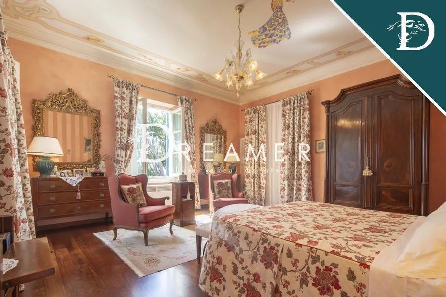 A dramatic original white marble staircase, topped by a fully frescoed ceiling, leads to the upper floors. The first floor features four elegant suites, each with a private bathroom; one boasts a charming private loggia overlooking the park and offering glimpses of the sea. Completing the floor are a study, an additional bathroom, and a splendid panoramic terrace, offering breathtaking sea views. The second floor features a charming attic apartment, comprising a living room, two double bedrooms, two bathrooms, a storage room, and a space designed, if needed, to accommodate a kitchen, making the floor potentially self-contained. The villa’s terraces offer a rare and breathtaking sea view, encompassing the entire horizon and offering breathtaking views at any time of day.