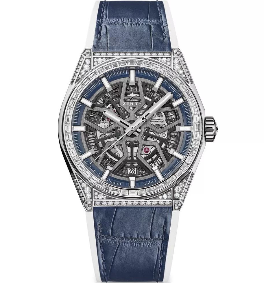 Discover the Zenith Defy Classic, reference 32.9001.670/78. R590. With a skeleton dial, this watch reveals the beauty of its internal mechanism. The stainless steel case set with diamonds and the blue leather strap add a touch of luxury and elegance.
