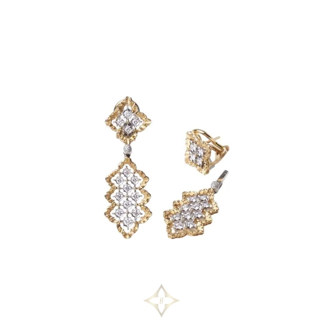 Buccellati Collection 18 karat gold Rombi Earrings add a flavour to your jewellery collection. These openwork drop earrings are set with three rows of round-cut diamonds. The 18 karat white gold earrings have 18 karat yellow gold borders and are set with diamonds weighing 1.07 carat in total.