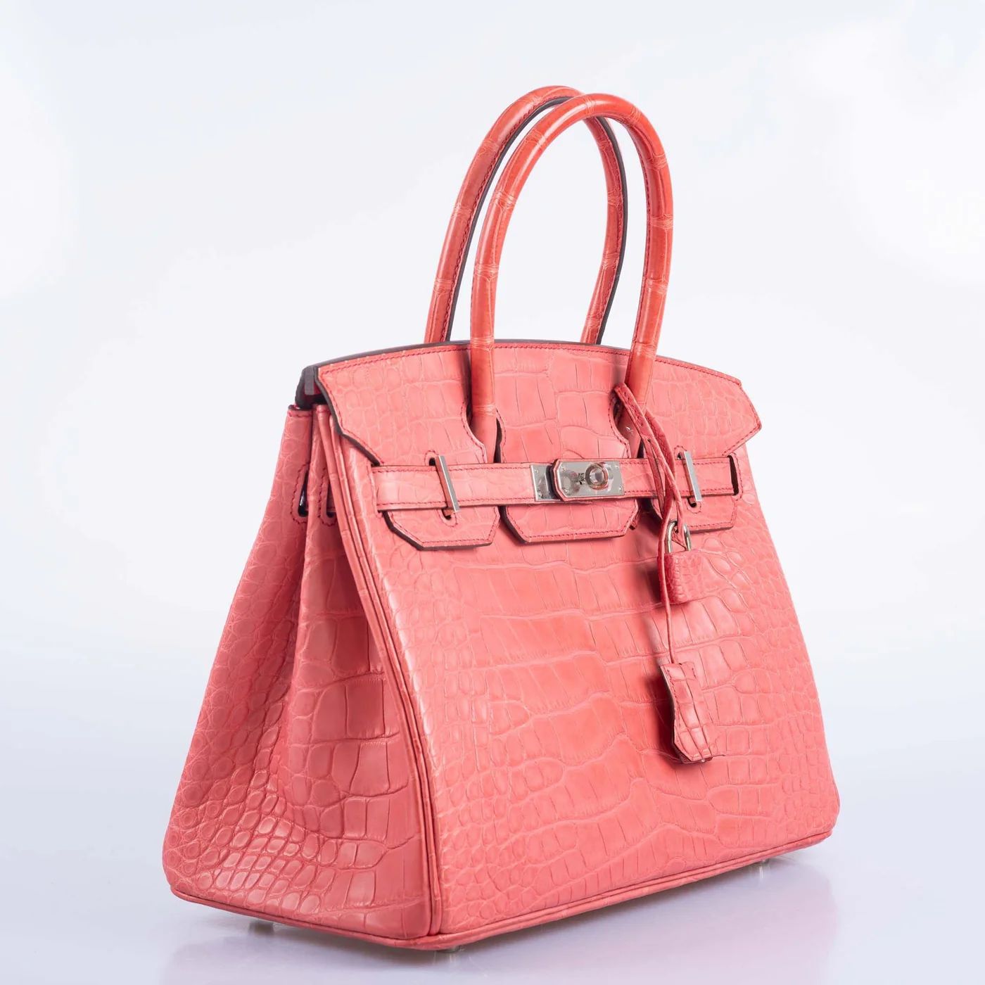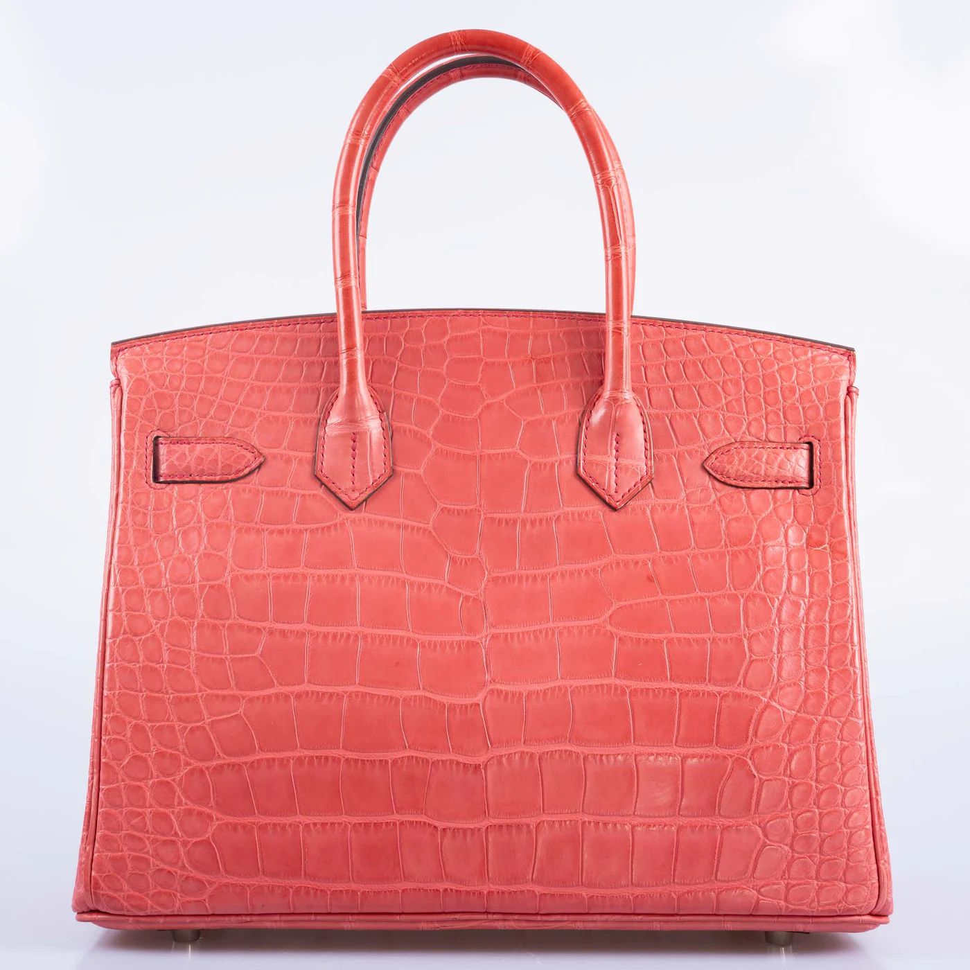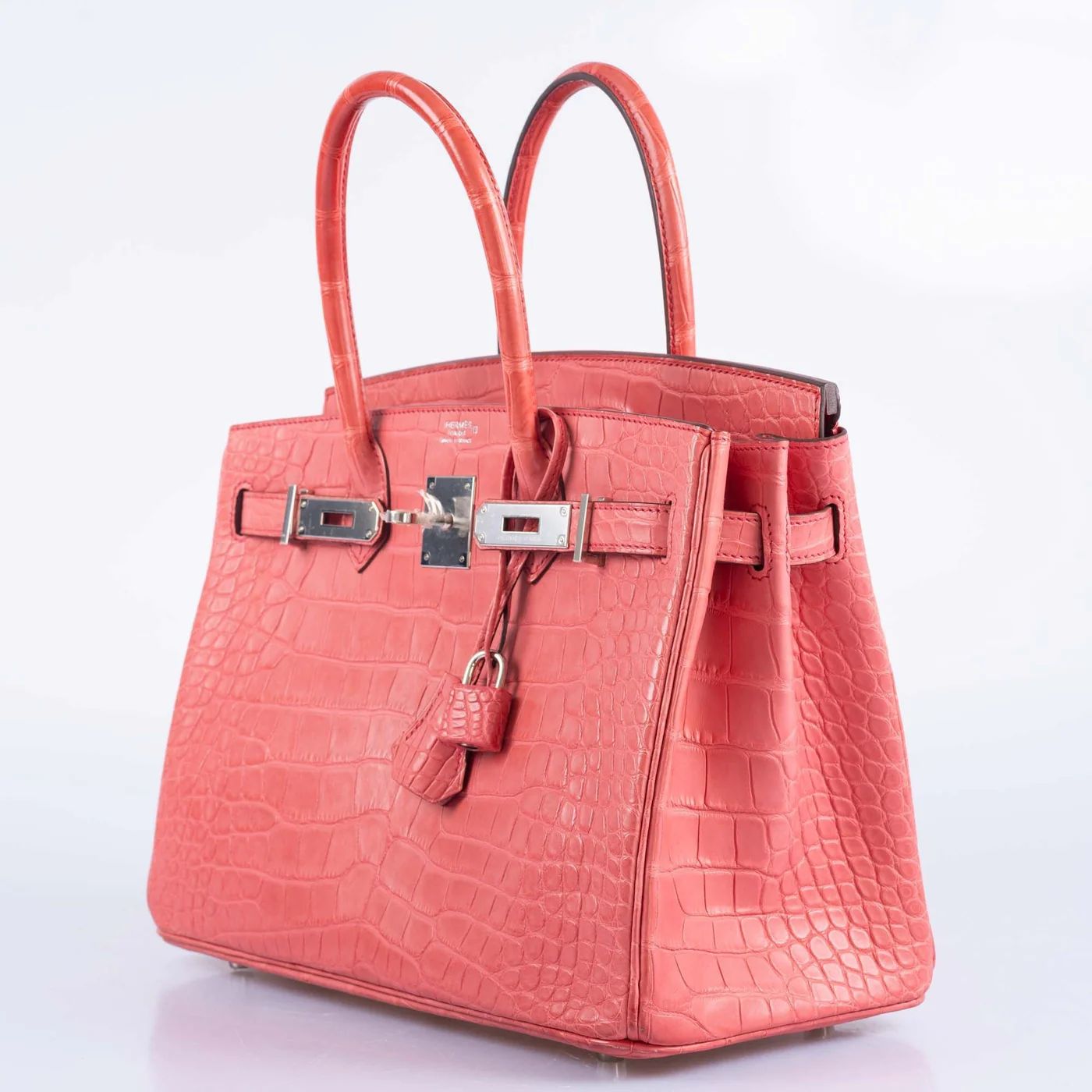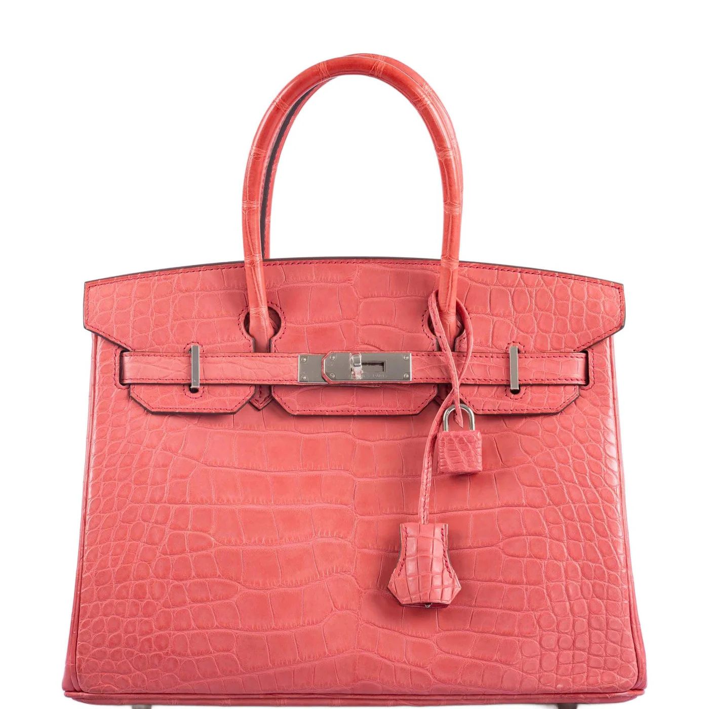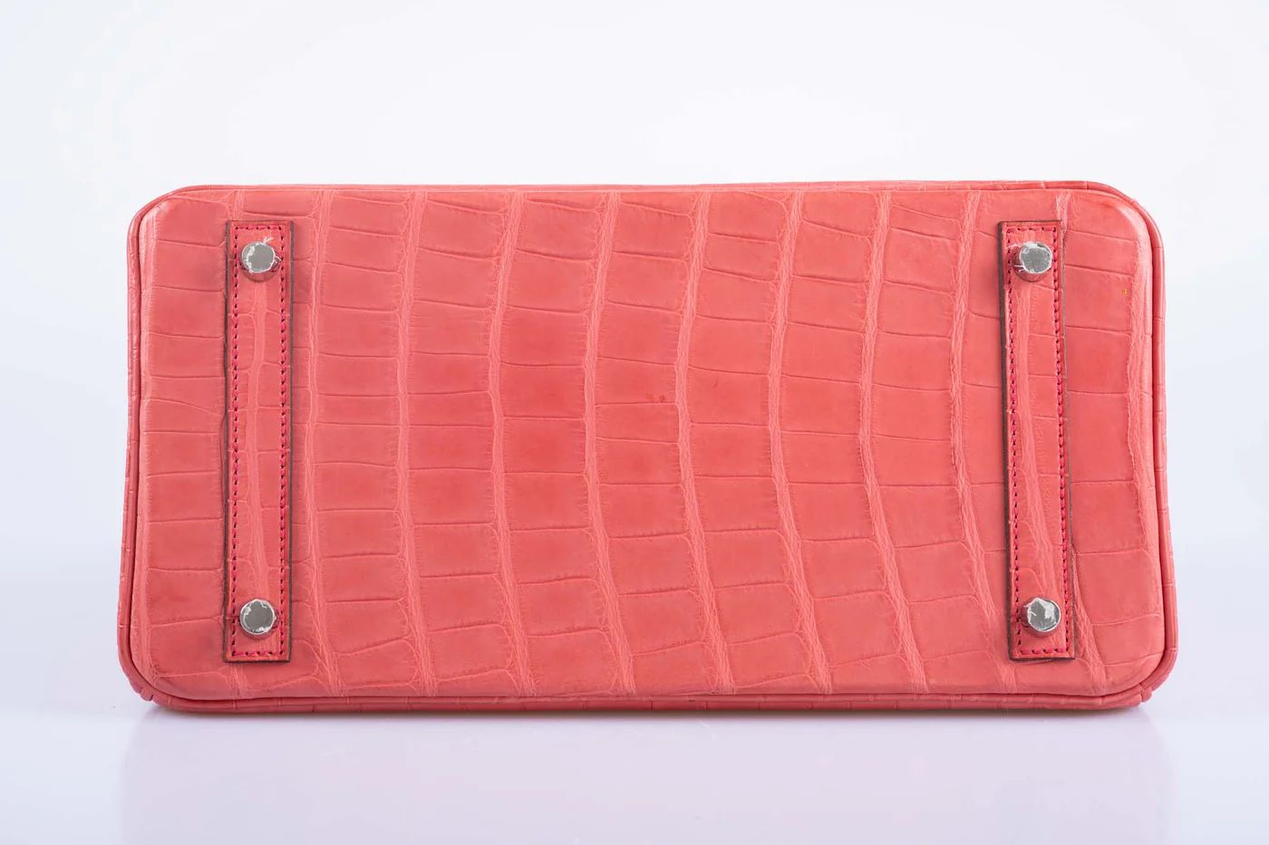 The Birkin 30 in Matte Bougainvillier Alligator with Palladium hardware. Alligator Mississippiensis features wider, flatter scales than crocodile, with a distinctive umbilical scar pattern. The hide takes dye exceptionally well.