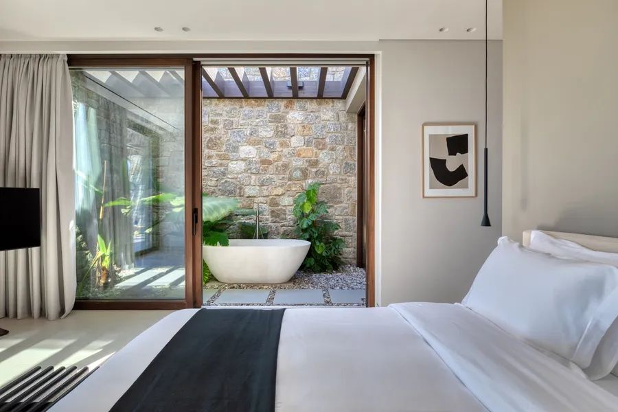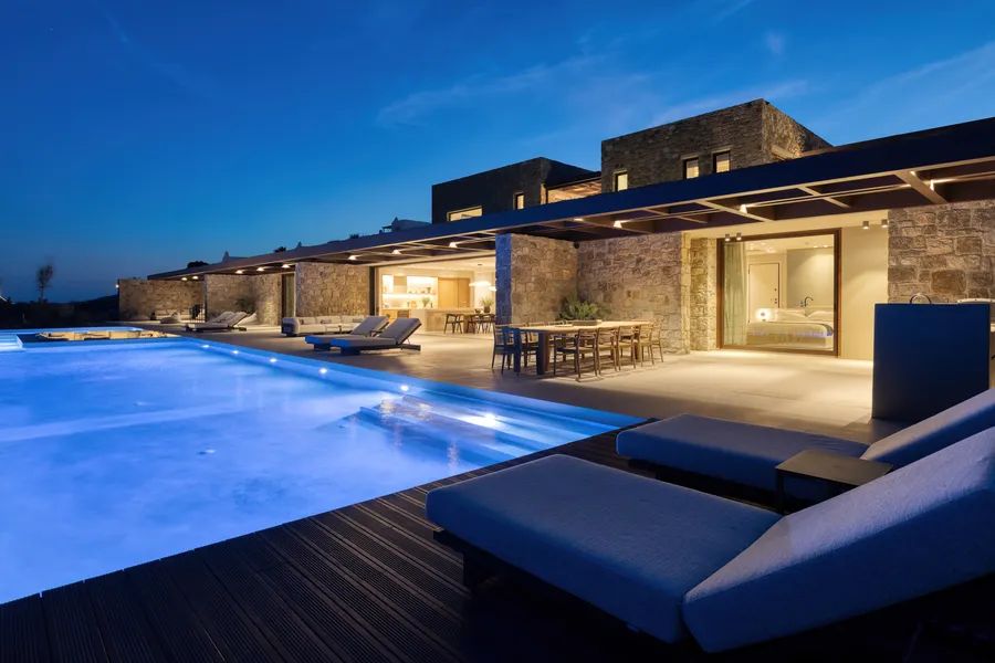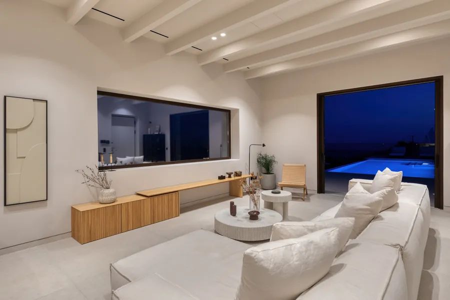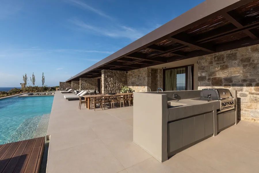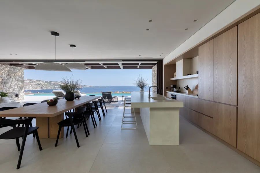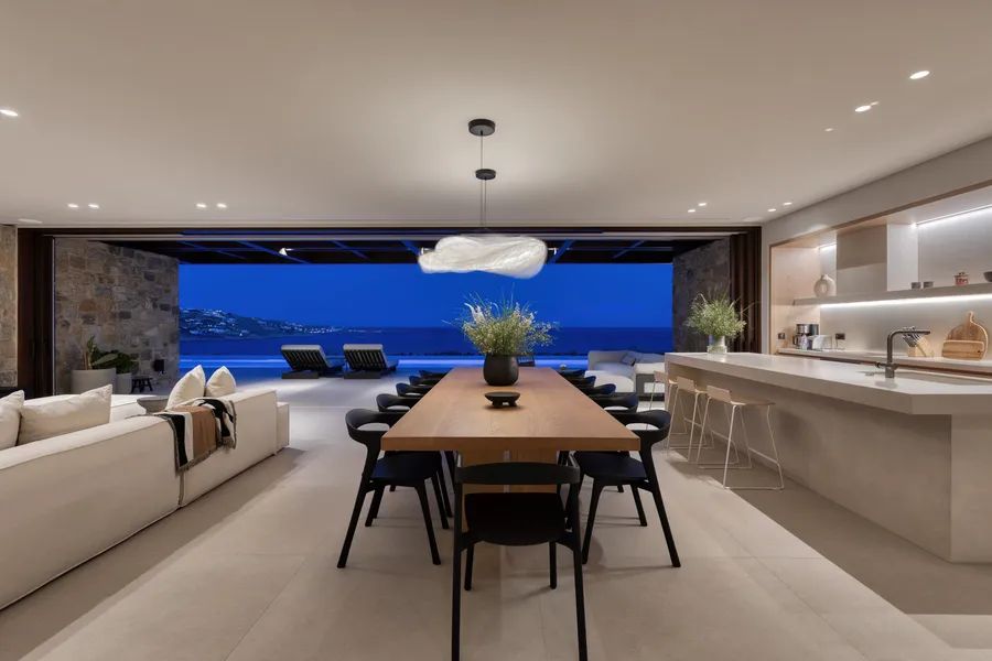 The architecture is modern and timeless, characterized by clean lines, open-plan living areas, and extensive use of natural materials that integrate the residence seamlessly into its surroundings. Large openings connect the interior spaces with expansive outdoor terraces, lounging areas, and the sea beyond, allowing for continuous indoor–outdoor living. The property is complemented by premium finishes, bespoke furnishings, state-of-the-art amenities, and an A++ energy certificate.