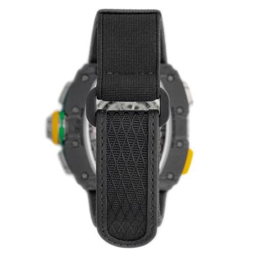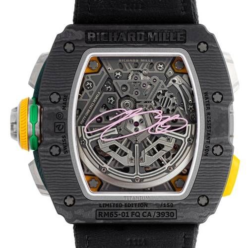 Richard Mille RM 65-01 Automatic Split-Seconds Chronograph Case in Carbon TPT bezel and caseback in the same material with titanium screws. Skeletonized multi-color dial with applied Arabic numerals. Powered by the automatic caliber RMAC4, featuring a flyback split-seconds chronograph, oversized date at 12 o’clock, function selector (W/N/H), and 60-hour power reserve. Color-coded pushers: green (start/stop), yellow (reset), and red quick-date pusher integrated into the crown. Fitted with a black fabric Velcro strap. A highly technical, sporty, and collectible timepiece – one of Richard Mille’s most sophisticated chronographs